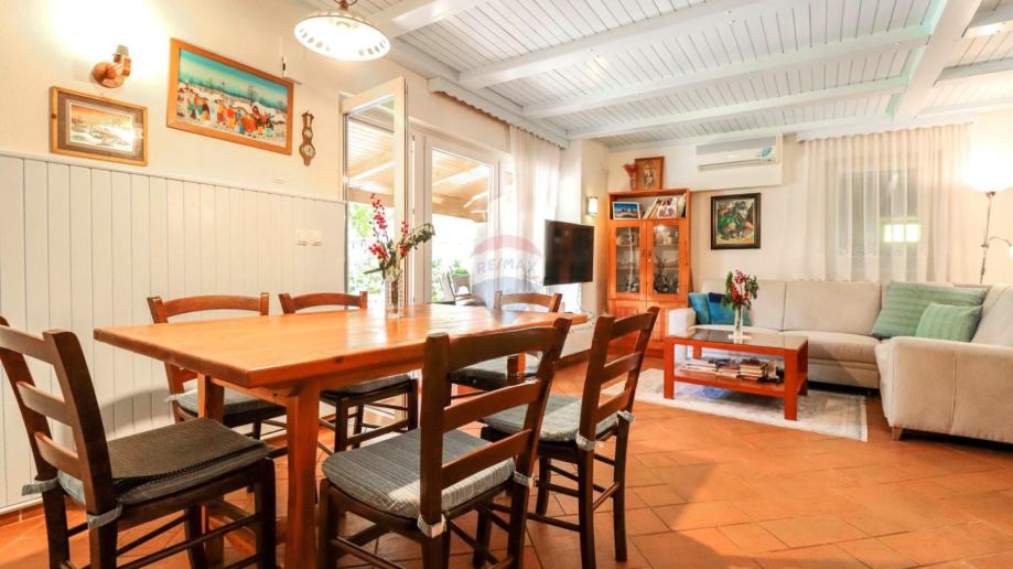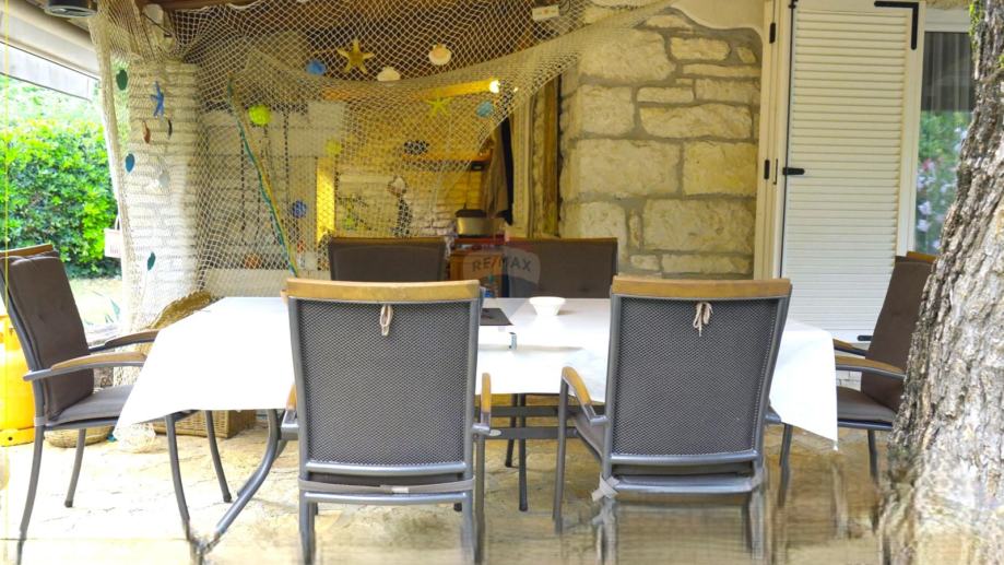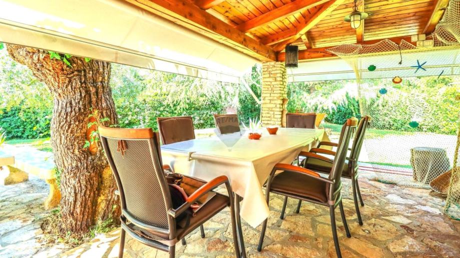 Kuća uključuje i natkrivenu terasu, smještenu u sklopu same kuće i ljetne kuhinje, savršeno mjesto za obiteljske obroke na otvorenom. Ljetna kuhinja opremljena je kaminom, stvarajući prostor idealan za uživanje u ljetnim mjesecima.