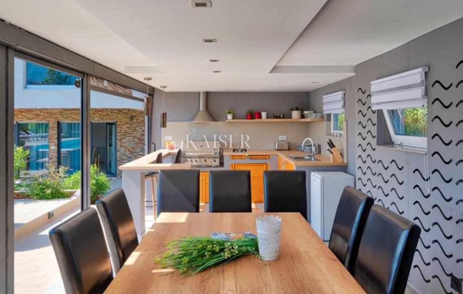 Vila u svome prostranom prizemlju staklenim stijenkama dijeli blagovaonicu s kuhinjom od bazena.