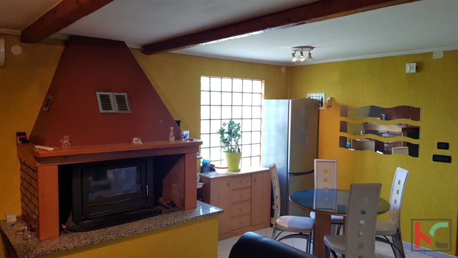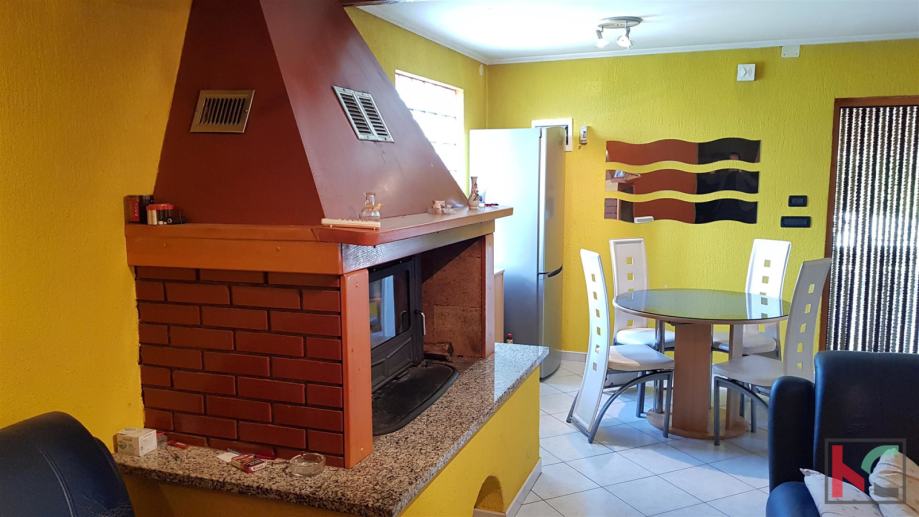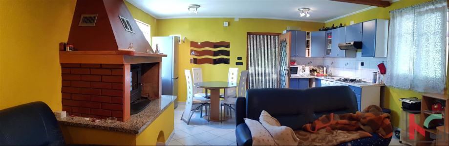 Tlocrtni raspored kuće obuhvaća zatvorenu verandu i terasu od 40-ak m2, dnevni boravak i kuhinju sa prekrasnim unutarnjim kaminom, dvije spavaće sobe te kupaonica.