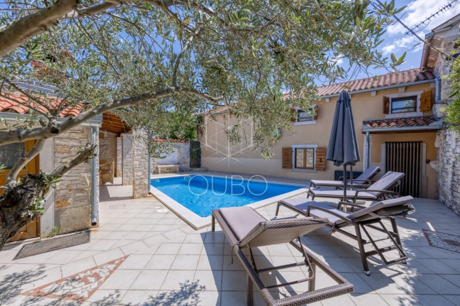 Nekretnina se sastoji od ugodnog dnevnog boravka, kuhinje s blagovaonicom, spavaćih soba i kupaonica, dok vanjski dio nudi privatno dvorište s bazenom, sunčalištem i natkrivenim prostorom za druženje. Tradicionalni istarski stil uspješno je spojen s funkcionalnošću i udobnošću.