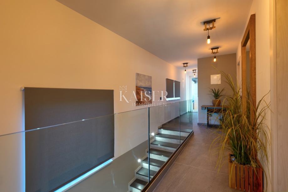 U prizemlju se nalazi svijetli dnevni boravak otvorenog koncepta s velikim staklenim stijenama koje omogućuju direktan izlaz na prostranu terasu i bazen. Elegantno uređena kuhinja s vrhunskim aparatima, uključujući hladnjak za vino, perilicu posuđa, pećnicu, mikrovalnu i aparat za kavu, pruža idealan prostor za pripremu gastronomskih užitaka. Blagovaonica i dnevni boravak opremljeni su modernim namještajem i velikim TV uređajem, a prostrana terasa s vanjskom kuhinjom, roštiljem i velikom aluminijskom pergolom pruža savršeno mjesto za opuštanje na otvorenom.