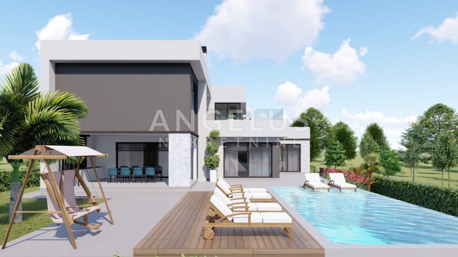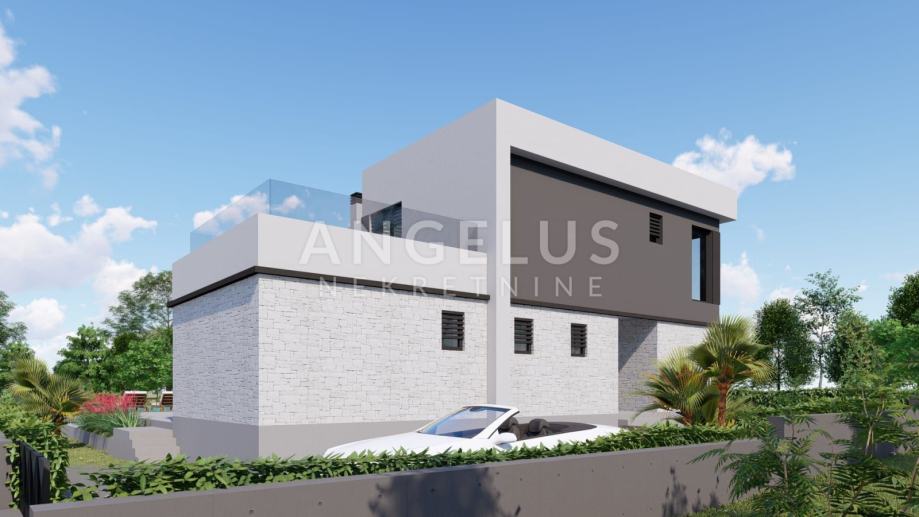 OPIS: Moderna kuća koja se počinje graditi u 10. mjesecu 2024. godine. Planiran završetak gradnje je godina dana. Kuća se u prizemlju sastoji od natkrivenog ulaza, hodnika, ostave, jedne spavaće sobe, kupaonice, spremišta, dnevnog toaleta te dnevnog boravka s kuhinjom i blagovaonicom u konceptu otvorenog prostora. Iz dnevnog boravka se izlazi na veliku terasu (preko 40m2) s koje pogled seže na preljevni bazen (32 m2) koji zauzima središnje mjesto u prostoru.