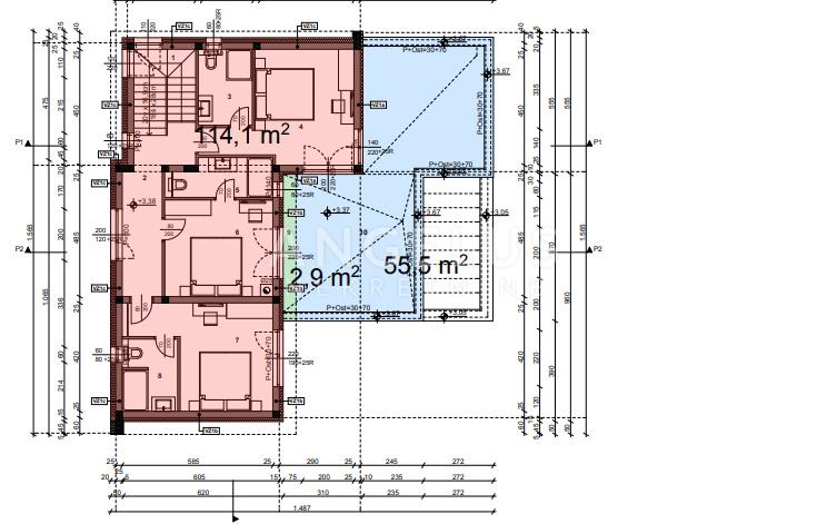 Gornji kat kuće se sastoji od još dodatne 3 sobe, svaka sa svojom kupaonicom te velike terase na koju dvije sobe imaju direktan pristup. Sa gornje terase seže pogled na otok Cres i planinu Velebit. Ova moderna vila je projektirana tako da bude maksimalno funkcionalna, izvodi se na zemljištu od ukupno 700 m2, u okolici je mirno te nije blizu drugih kuća. Izvođenje radova je s posebnom pažnjom na kvalitetu radova i ugrađenih materijala kao i opreme.