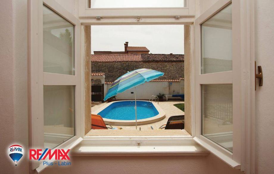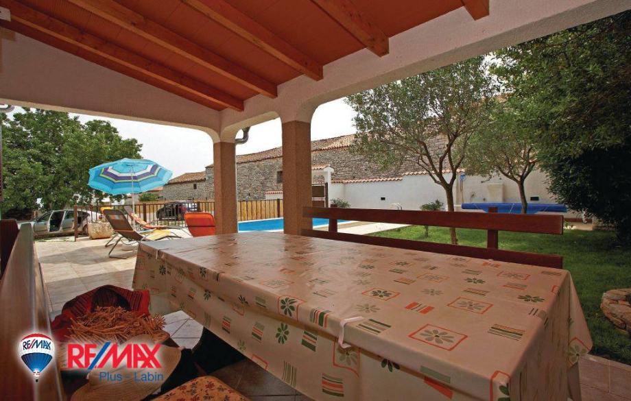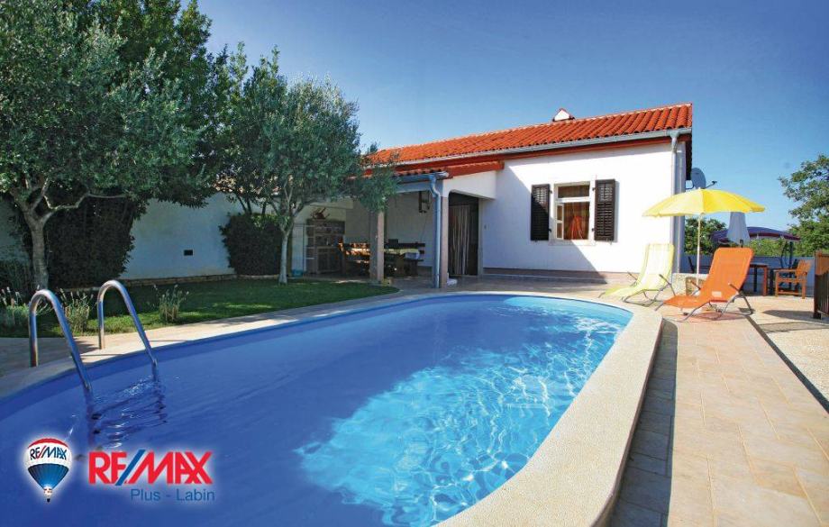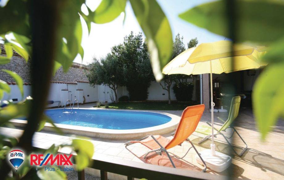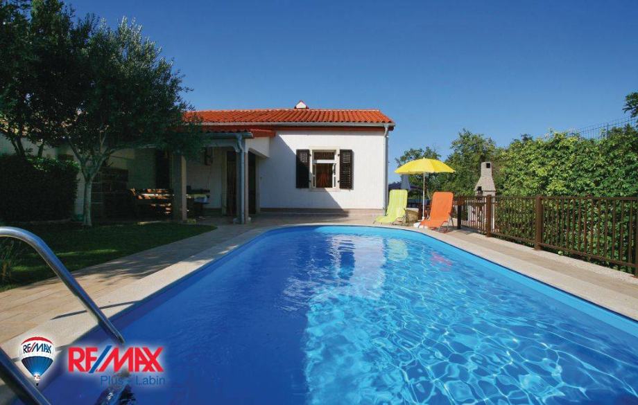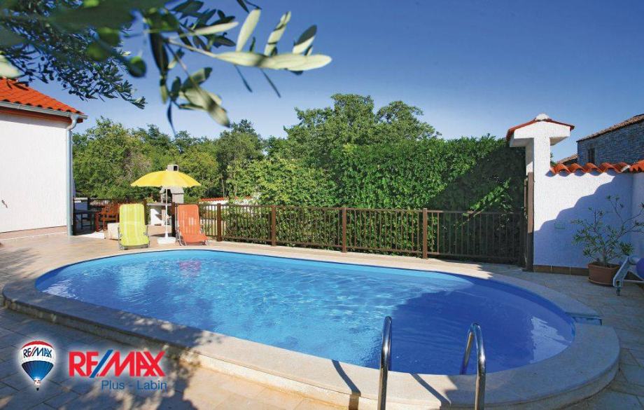 Na lijepo uređenoj i ograđenoj okućnici smjestio se bazen, zasebno spremište, vanjski tuš, roštilj i natkriveno parkiralište te garaža.