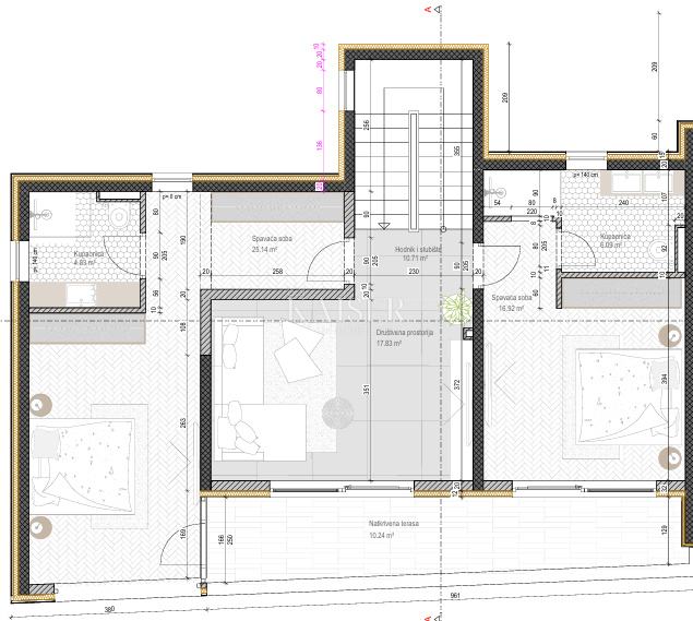 Na gornjoj etaži, odmah nasuprot stubišta, nalazi se višenamjenska prostorija površine 17,83 m² koja se može koristiti kao društvena soba ili dodatna spavaća soba, a iz koje se izlazi na natkrivenu terasu od 10,24 m². Glavna spavaća soba prostire se na 25,14 m² te posjeduje vlastitu modernu kupaonicu od 4,83 m². Druga spavaća soba veličine 16,92 m² također ima vlastitu prostranu kupaonicu površine 6,09 m², opremljenu tušem, WC-om i dvostrukim umivaonikom. Grijanje u cijeloj kući izvedeno je putem podnog grijanja na struju, a dodatnu udobnost osiguravaju klima uređaji predviđeni u svim prostorijama, koji služe i za grijanje i za hlađenje.