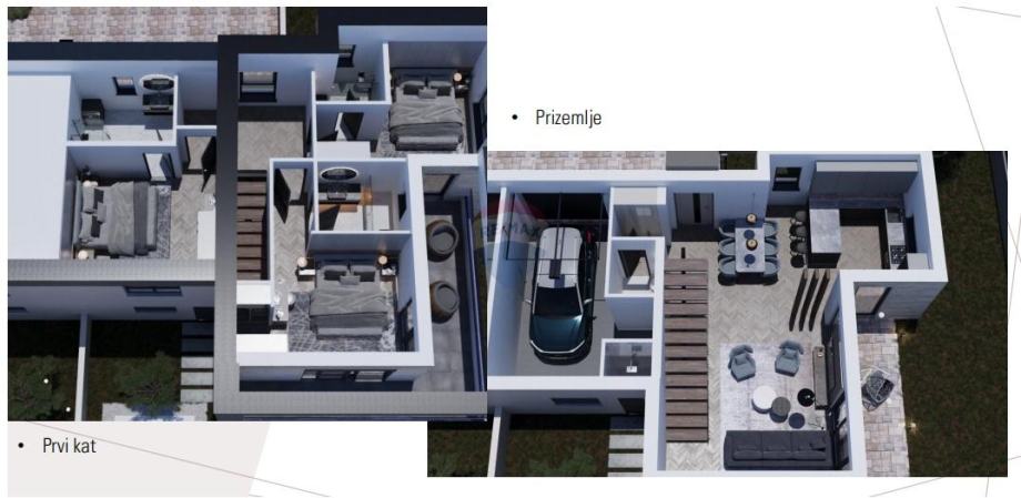 Sastoji se od prizemlja : dnevni boravak s kuhinjom i blagovaonom, toalet, natrkrivena terasa i garaža.