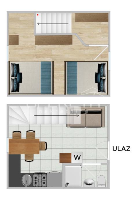 Prizemlje: dnevni boravak s kuhinjom i blagovaonicom te kupaonica s tušem