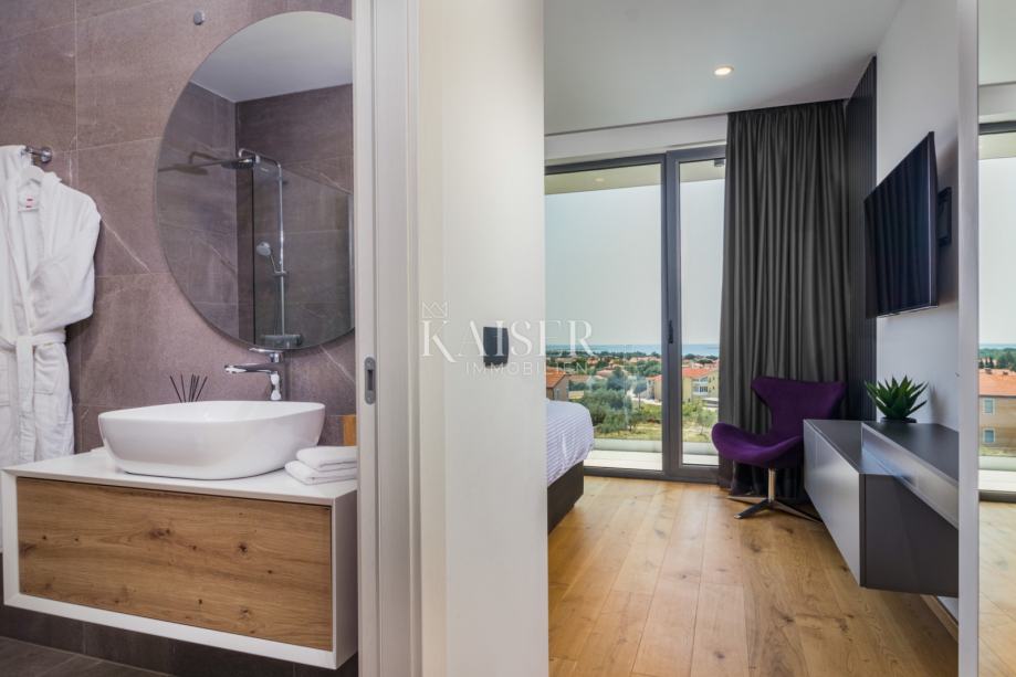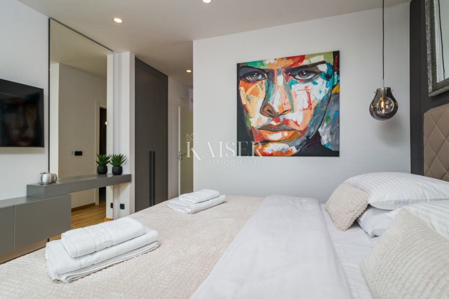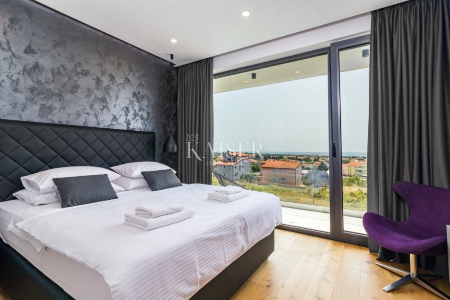 Elegantno drveno stubište vodi na prvi kat gdje se nalaze četiri spavaće sobe, svaka s vlastitom modernom kupaonicom i izlazom na prostranu terasu s djelomičnim pogledom na more. Svaka prostorija opremljena je klima uređajem, dok cijela vila ima podno grijanje koje se također može kontrolirati putem aplikacije, osiguravajući maksimalnu udobnost tijekom cijele godine. Sav namještaj izrađen je po mjeri u profinjenim, bezvremenskim tonovima i uključen je u cijenu nekretnine.