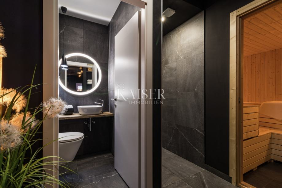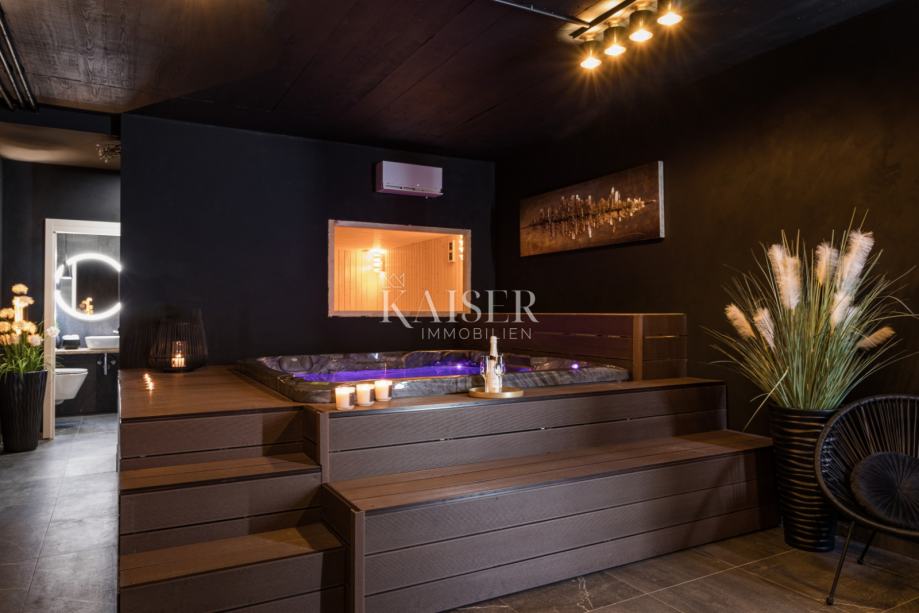 Poseban doživljaj pruža vanjski prostor. Grijani infinity bazen dimenzija 10,60 x 3,60 metara savršeno je uklopljen u uređenu okućnicu, a pravo iznenađenje predstavlja luksuzna wellness zona s jacuzzijem za pet osoba, finskom saunom, kupaonicom i relax zonom s televizorom – privatni spa u udobnosti vlastitog doma. Dodatno, na raspolaganju su vešeraj i spremište, čime je funkcionalnost dovedena do savršenstva.