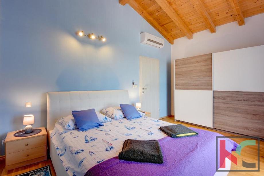 Unutarnje stepenište vodi na prvi kat vile, gdje se nalaze tri klimatizirane spavaće sobe, dvije kupaonice,jedna sa kadom, a jedna sa tušem, kao i dva balkona s pogledom na more, od kojih je jedan 30 m2 natkriven pergolom.