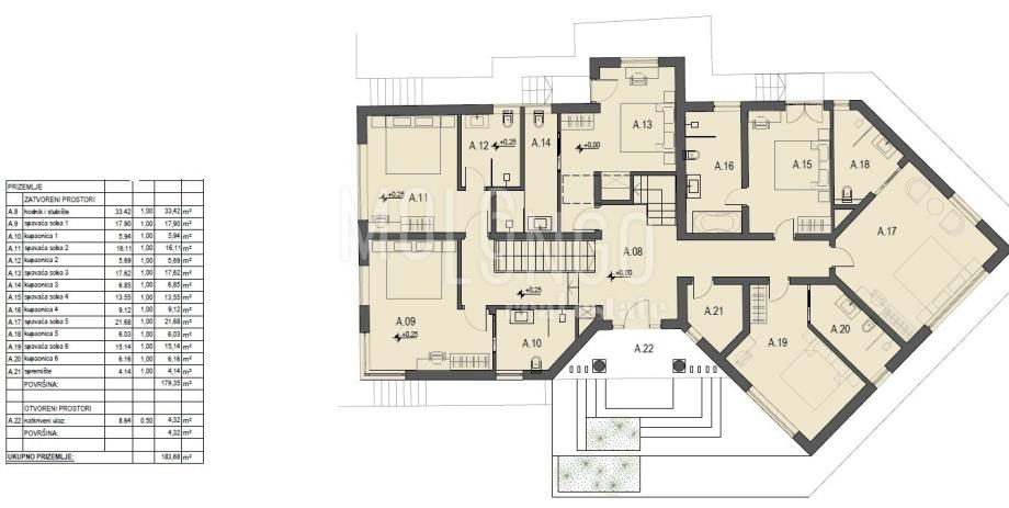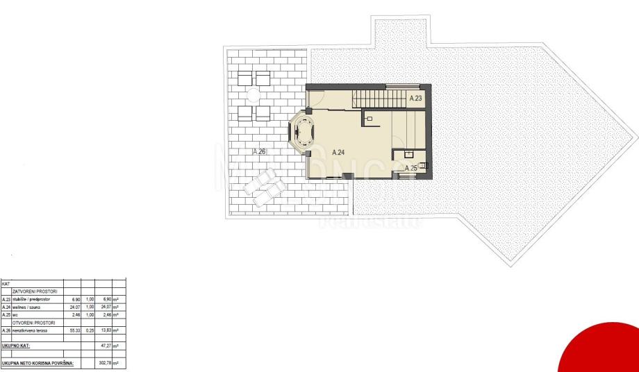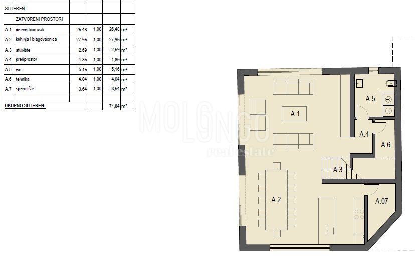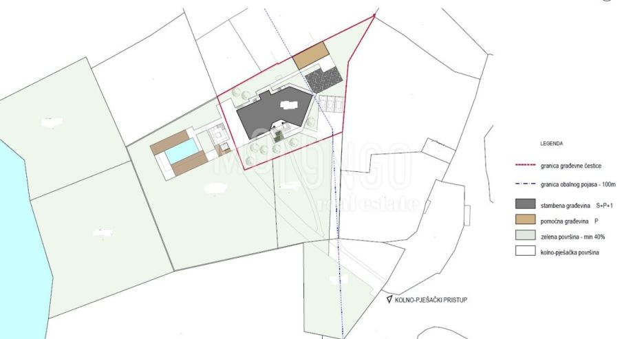 Na parceli se nalazi kuća sagrađena 2000. godine, tlocrtno podijeljena na suteren, prizemlje i kat, s pravomoćnom građevinskom dozvolom za renoviranje u luksuzni objekt s šest spavaćih soba, svaka s vlastitom kupaonicom. Projekt uključuje i wellness prostor sa saunom, prostranu krovnu terasu s panoramskim pogledom, prostrani dnevni boravak, kuhinju i igraonicu.