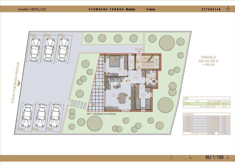 Kaiser Immobilien agencija stavlja u svoju ponudu stan sa okućnicom i parkirnim mjestima u Medulinu.