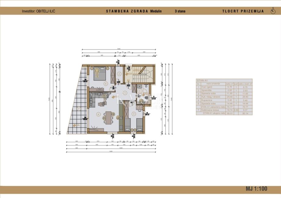 Stan je površine 70,77 m2, ima veliku natkrivenu terasu 16,7 m2, okućnicu od 150 m2 i dva parkirna mjesta.