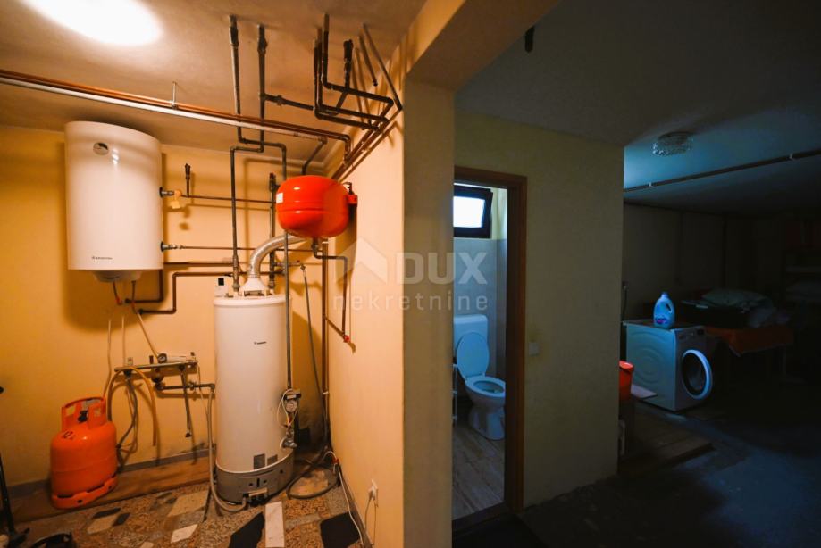 Suterenski dio ima oko 150 m2 stambenog prostora i posjeduje konobu s zidanim kaminom i kuhinjom, dva garažna dijela , utility sobe, ostave, veliki hodnik te je suteren povezan s unutrašnjosti kuće s više dijelova.