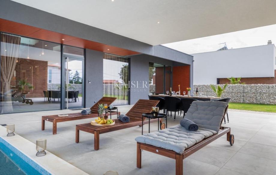Prostrana okućnica u potpunosti je uređena te ograđena. Pruža parking za više automobila, uređeni travnjak, sunčalište te grijani bazen ukupne površine 43 m2.