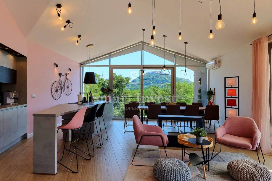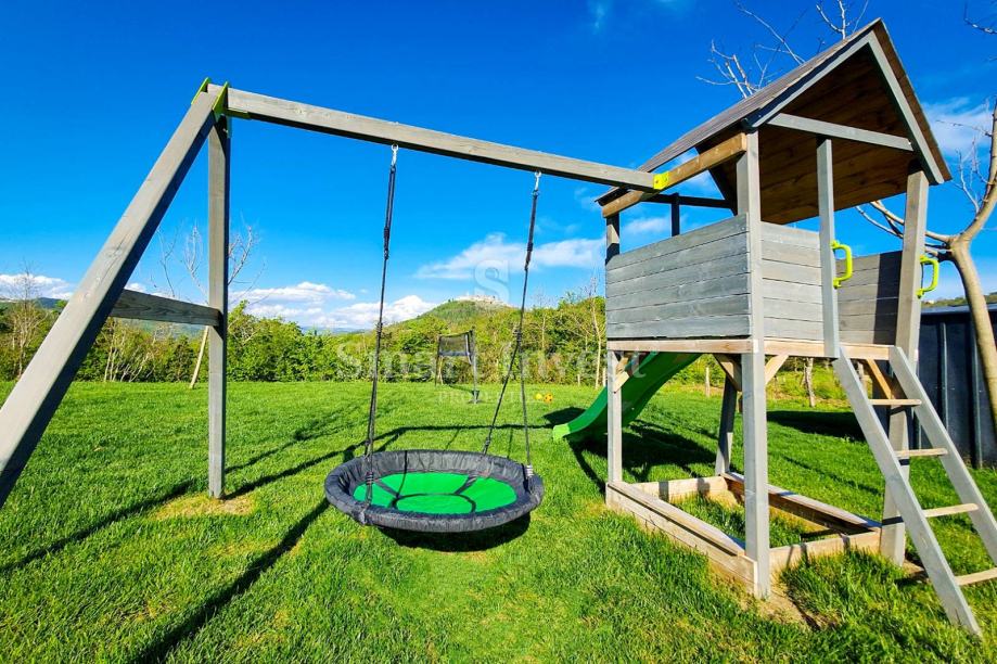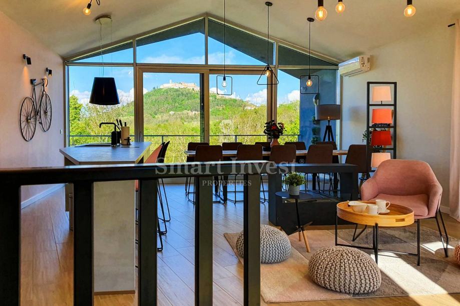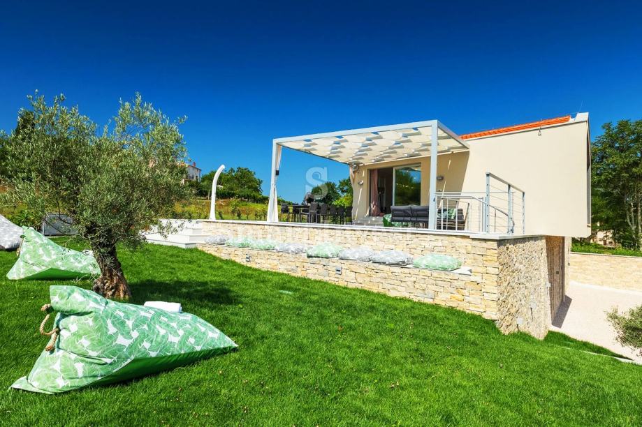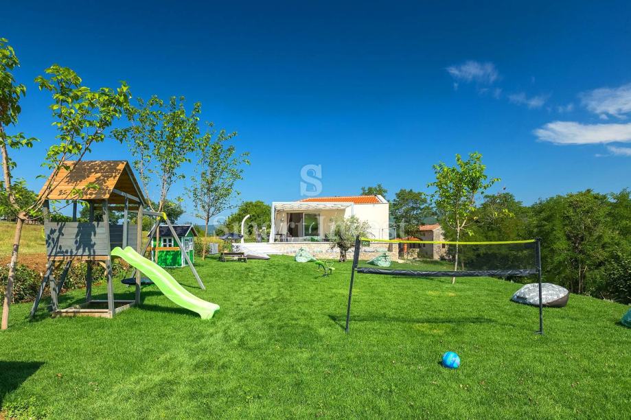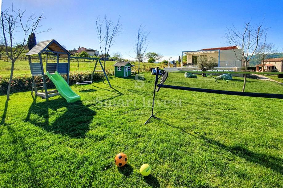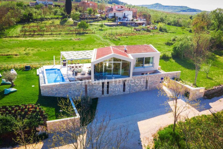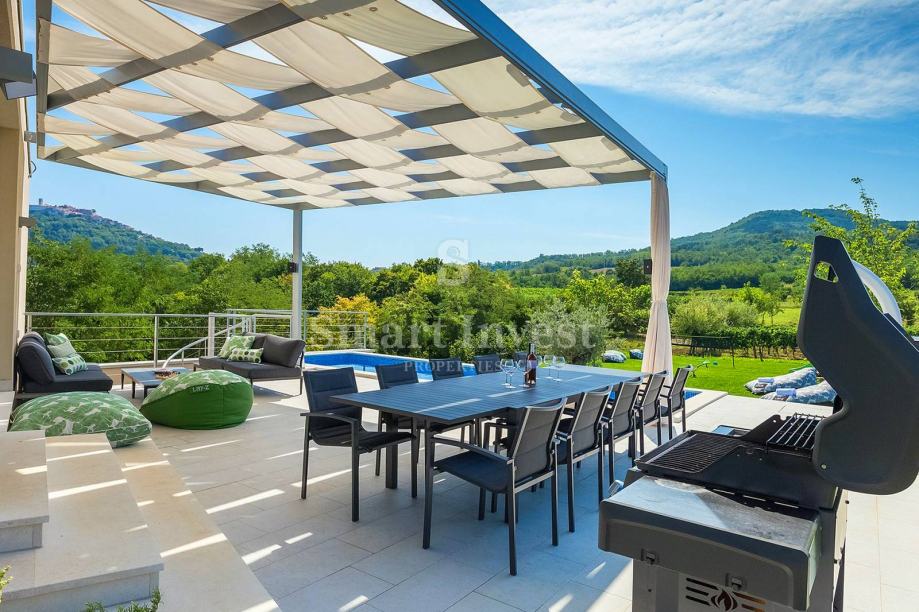 MOTOVUN, Nova vila moderne arhitekture i elegantnog interijera, s grijanim bazenom i raznolikim sadržajima za djecu na jedinstvenoj lokaciji s pogledom na Motovun kao na dlanu, okružena prirodom.