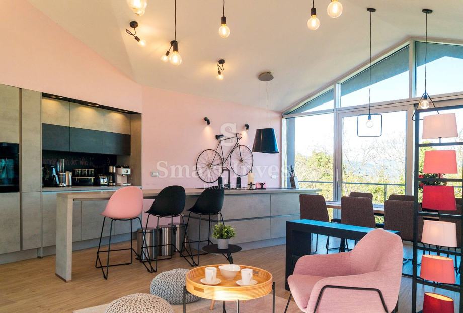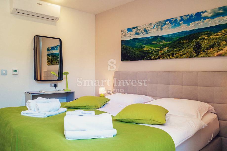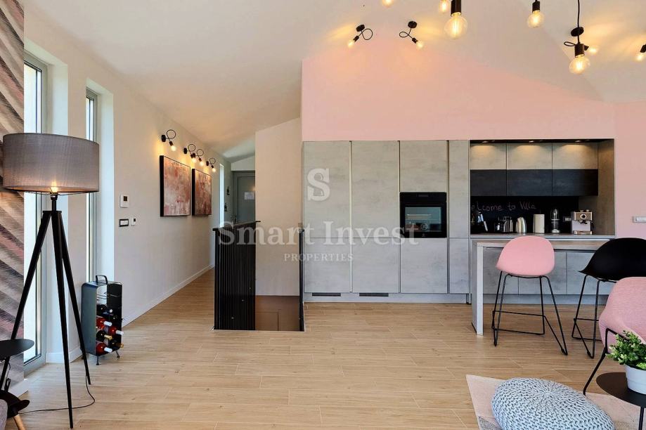 U prizemlju su smještene četiri komforne spavaće sobe sa en-suite kupaonicama. Duž cijelog prizemlja prostire se atrij, koji je opremljen kao dodatni lounge prostor. Na katu se nalazi open space dnevni boravak s kuhinjom i blagovaonom koji ima veliki stakleni zid s jedinstvenim pogledom na Motovun kao na dlanu, wc za goste, te primarni lounge prostor koji je trenutno uređen kao igraonica za djecu, a može se pretvoriti u klasičan wellness prostor s predivnim pogledom.