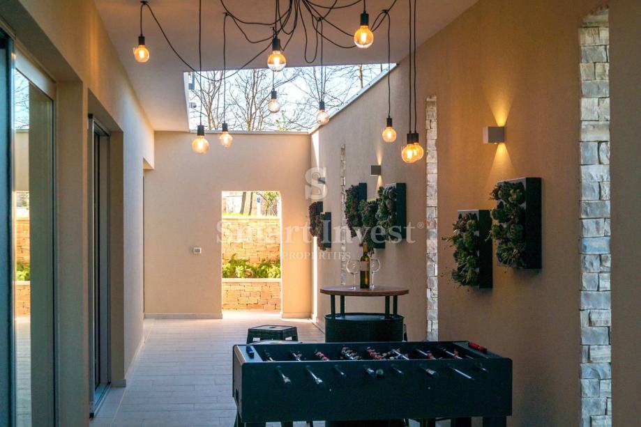 Na lijepo uređenoj okućnici se nalazi velika terasa s lounge prostorom opremljenim TV-om za vanjsko korištenje kojemu ne smeta sučeva svjetlost, u nastavku terase je grijani bazen od 22 m2 s vanjskim tušem, te roštilj. Dio okućnice uređen je kao dječje igralište, tu su stolni nogomet, kućica za djecu, odbojka, badminton, dječji tobogan i ljuljačka. Također je ovdje prostrani parking za više automobila.