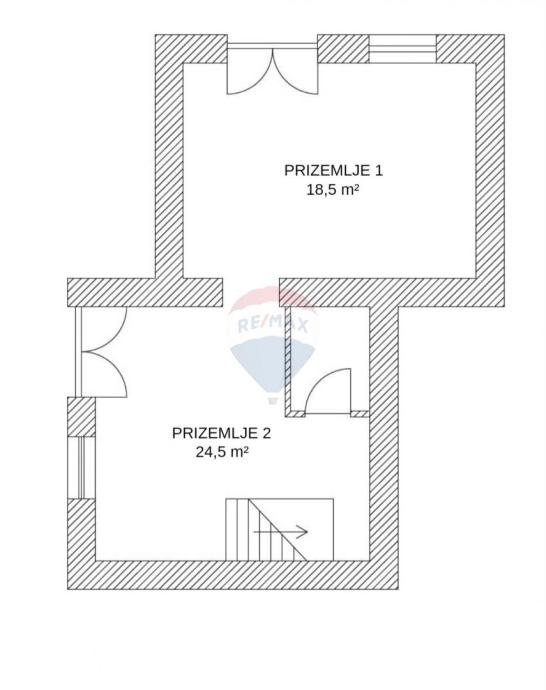 U prizemlju se nalaze dvije prostorije - jedna na nivou ulaza te druga do koje se stiže stepenicama i koja ima izlaz u vrt/okućnicu. Kuću omeđuju dvije čestice koje pripadaju općini i trenutno je jedna od njih dana na korištenje vlasniku na pet godina i postoji mogućnost otkupa. Time bi se dobila okućnica od 200 m2 i izlaz na još jednu ulicu odakle bi se mogao napraviti još jedan ulaz.