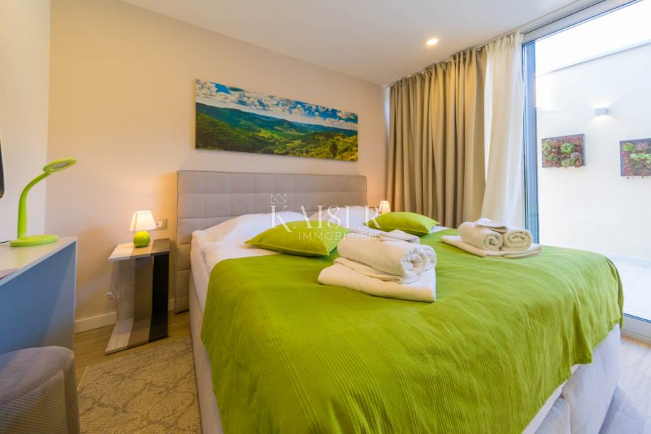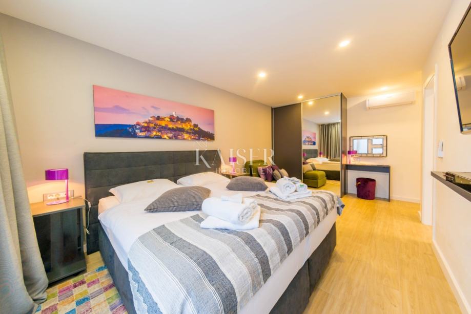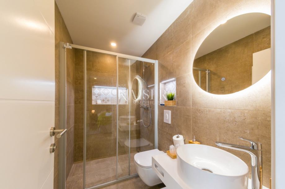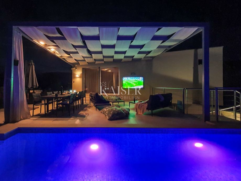 Ova moderna vila prostire se na ukupno 197 m2 raspoređenih na dvije etaže – suteren i prvi kat. U suterenu se nalazi hodnik s perilicom i sušilicom rublja te četiri prostrane spavaće sobe, svaka s vlastitom kupaonicom, što jamči maksimalnu udobnost i privatnost za sve članove obitelji ili goste. Dio etaže čini atrij površine 25 m2, djelomično natkriven i idealan za jutarnje opuštanje ili večernje druženje u intimi vlastitog doma.