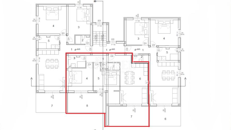 Ovaj dvosoban stan koji se nalazi na drugom katu ima površinu od 66m2, čak dvije prostrane lođe ukupne površine 33m2 te ima ukupno neto stambenu površinu od 92m2. Sa prostranih lođa se pruža lijepi pogled na grad Novigrad i more. Stan se sastoji od dnevnog boravka, sa blagovaonicom i kuhinjom od 26m2, dvije spavaće sobe površina 12m2 i 15m2, kupatila od 5m2 i WC-a od 3m2 i hodnika od 5m2. Lođama sa lijepim pogledom pristupa se iz dnevnog boravka te iz jedne od spavaćim soba. Stanu pripada jedno parkirno mjesto ispred zgrade.