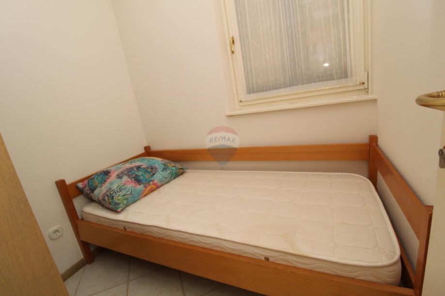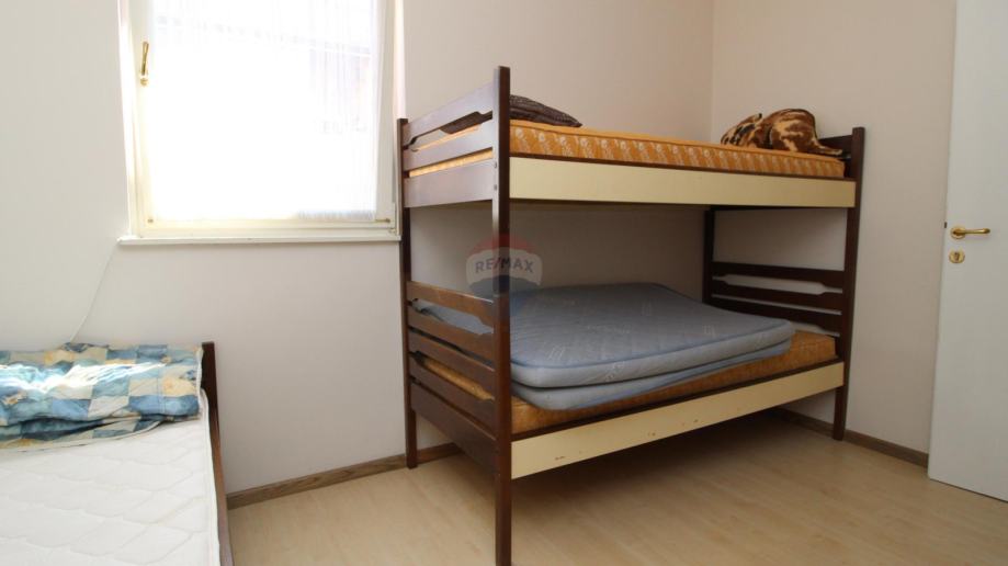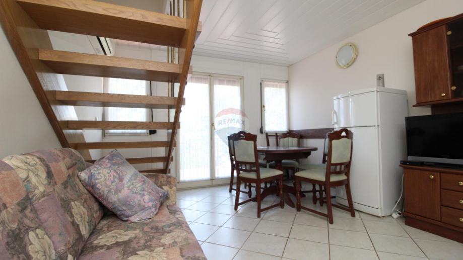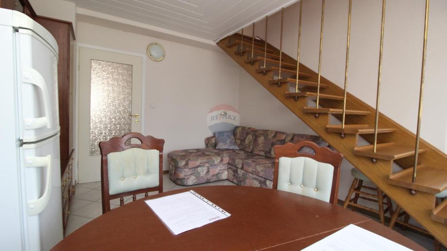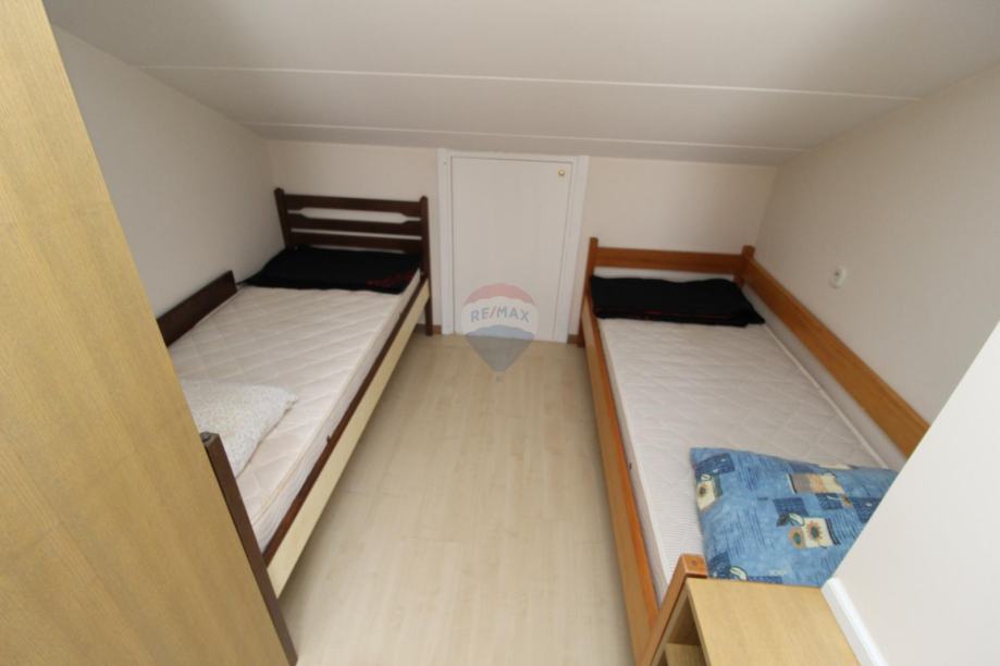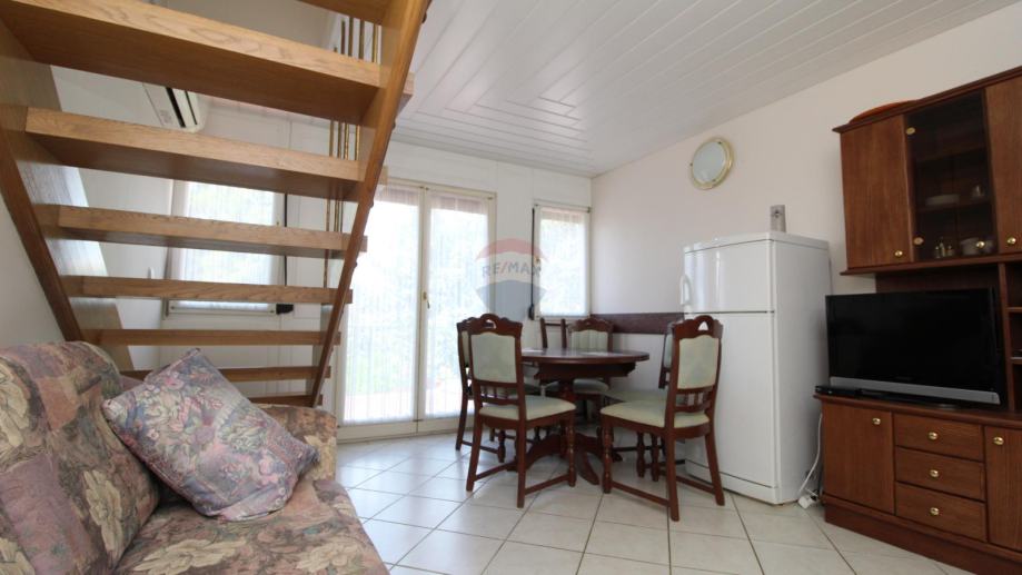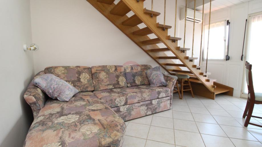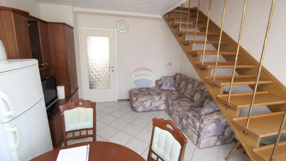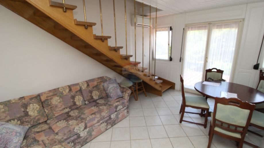 Na prvoj etaži nalazi se mala spavaća soba s kuhinjom kupaonom te dnevnim boravkom sa stepenicama za ulazak u drugu spavaću sobu.