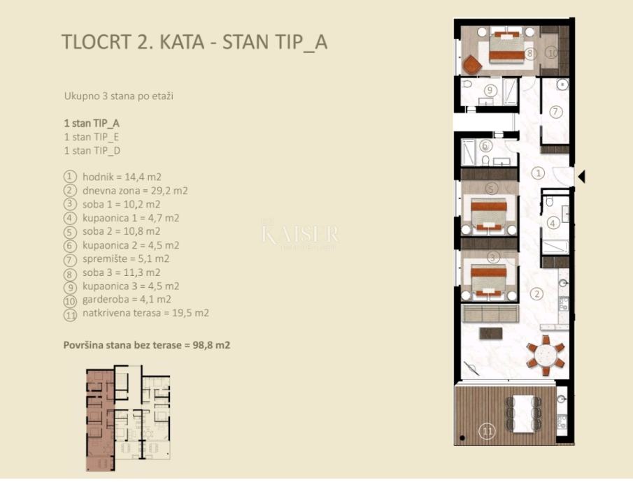 Ovaj prekrasan stan nalazi se na drugom katu, do kojeg se dolazi liftom. Stambeni dio stana ima 98 m2 što uključuje ulazni hodnik, dnevnu sobu i kuhinju, 3 spavaće sobe, 3 kupaone te spremište/ostavu u koje možete smjestiti i perilicu i sušilicu te ostale kućne aparate koje svakodnevno upotrebljavate.