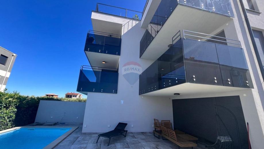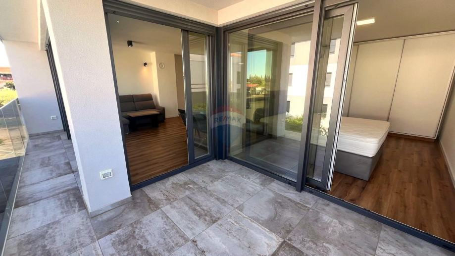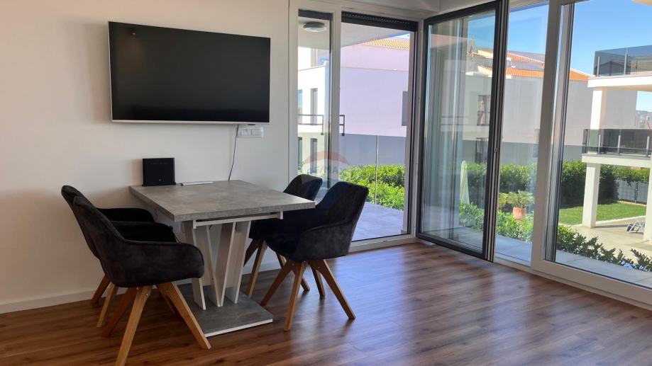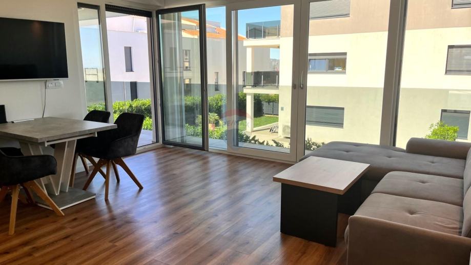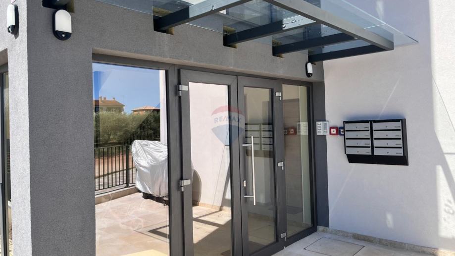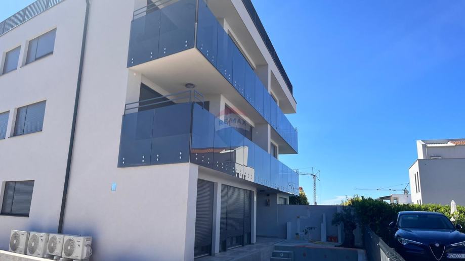 Stan smješten na prvom katu moderne zgrade s liftom, ukupne površine 65,20 m². Sastoji se od ulaznog hodnika, kupaonice, dvije spavaće sobe te velikog open space prostora koji uključuje kuhinju, blagovaonicu i dnevni boravak s izlazom na natkrivenu terasu s koje se pruža prekrasan pogled na more.