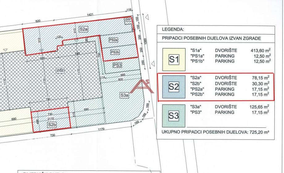 kupaonica i veliki balkon. Iza objekta je dvorište, vrtna kućica i parking.