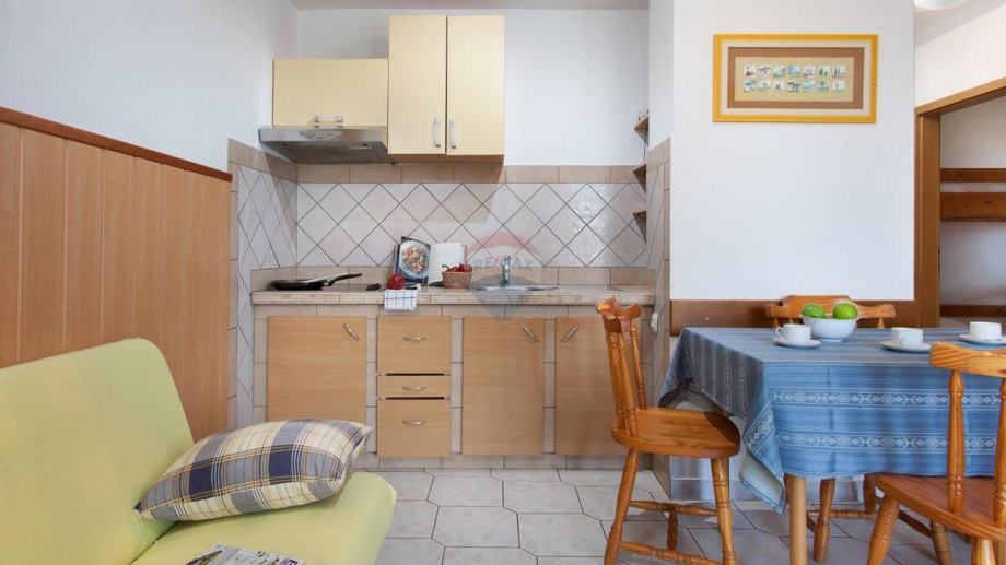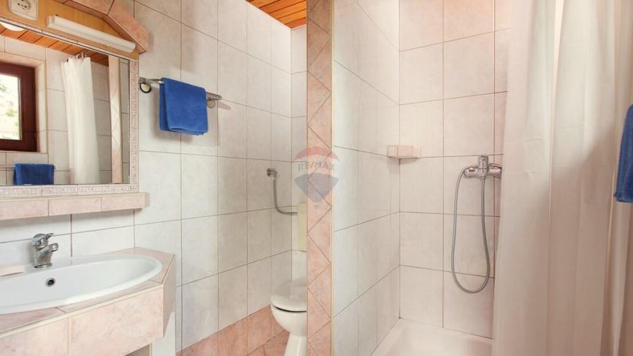 Vanjske stepenice vode do prvog kata, gdje se nalazi još jedan šarmantan apartman. Ovaj prostor uključuje kuhinju, dvije spavaće sobe, kupaonicu i blagovaonicu koja vodi na prostranu terasu s impresivnim pogledom na more i prirodnu okolicu. Stvarajući idiličan ambijent za opuštanje, terasa je mjesto gdje ćete uživati u predivnom okruženju.