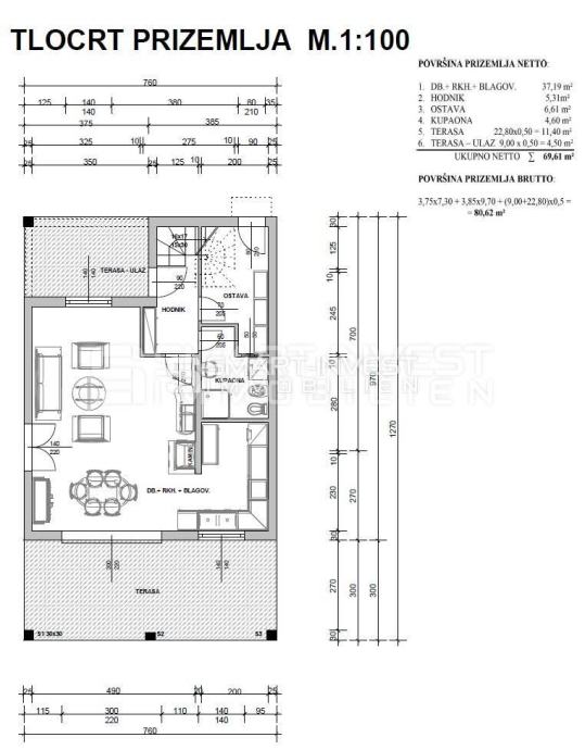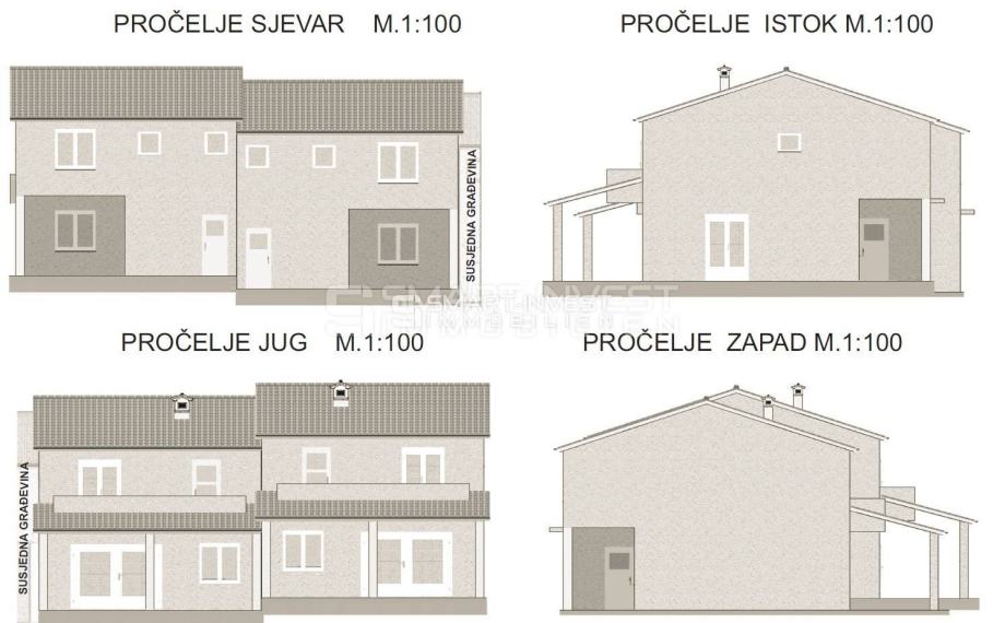 Kuće su katnice površine 150 m2, vrlo funkcionalnog rasporeda: na prizemlju je natkriveni ulazni trijem te hodnik, ostava, kupaonica, veliki dnevni boravak, kuhinja i blagovaona s izlazom na veliku natkrivenu terasu i bazen sa sunčalištem.