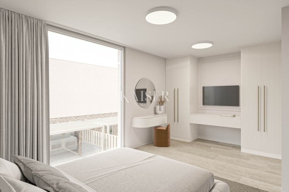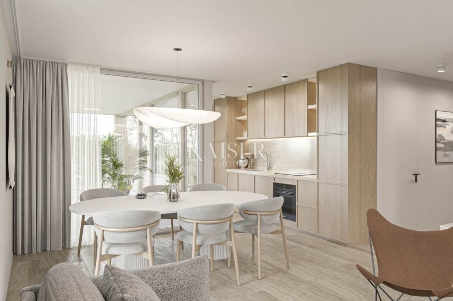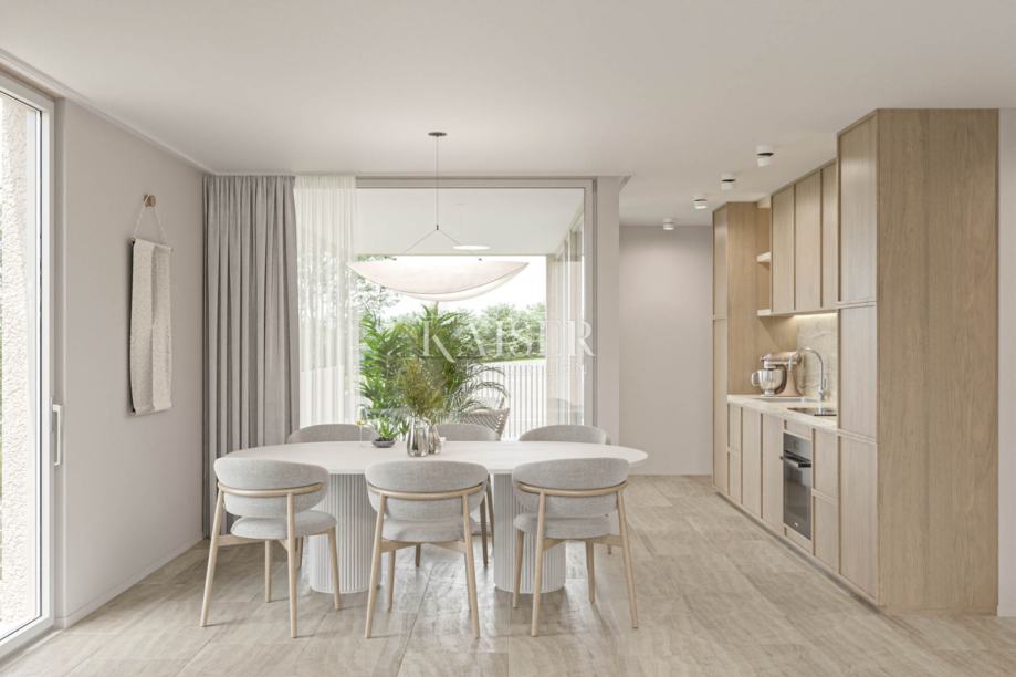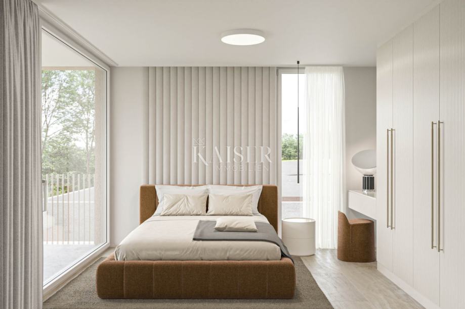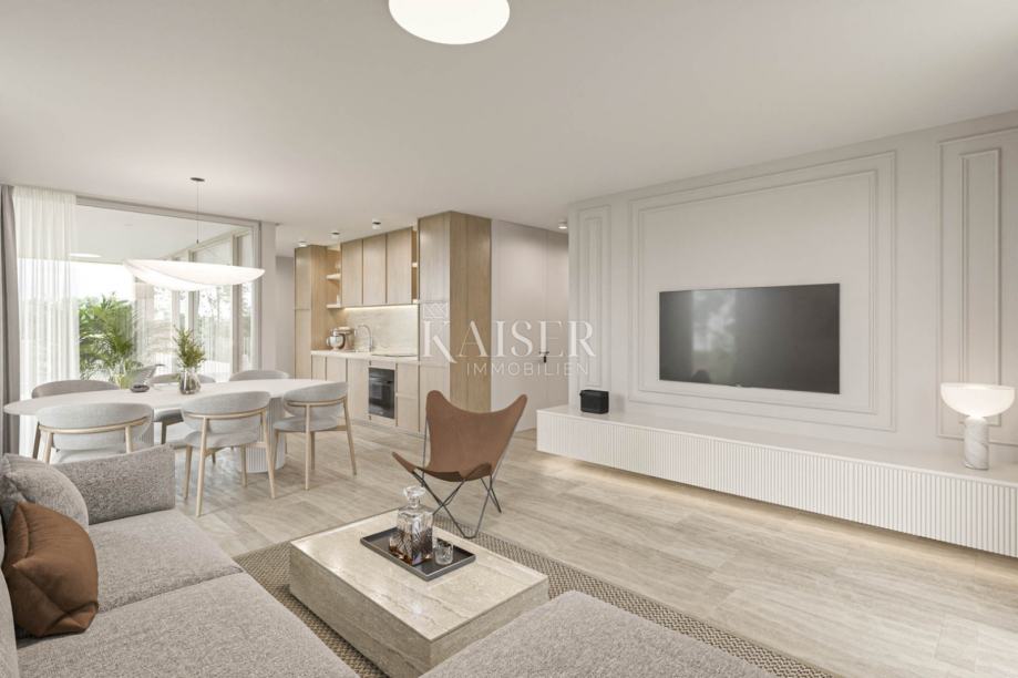 Kaiser Immobilien predstavlja stan na odličnoj lokaciji udaljen 300 m od mora i 400 m od lijepo uređene plaže. Stan je smješten u okolici Novigrada te ima neto površinu od 110, 95 m2. Stan se nalazi u prizmelju, a sastoji od ulaznog hodnika, 2 kupatila, 4 spavaće sobe uz fleksibilnost da se neka od spavaćih soba koristiti kao radna soba ili garderoba, te open space prostor u kojem se nalazi kuhinja s blagovaonicom te dnevni boravak s izlazom na terasu i vrt od 274, 80 m2.