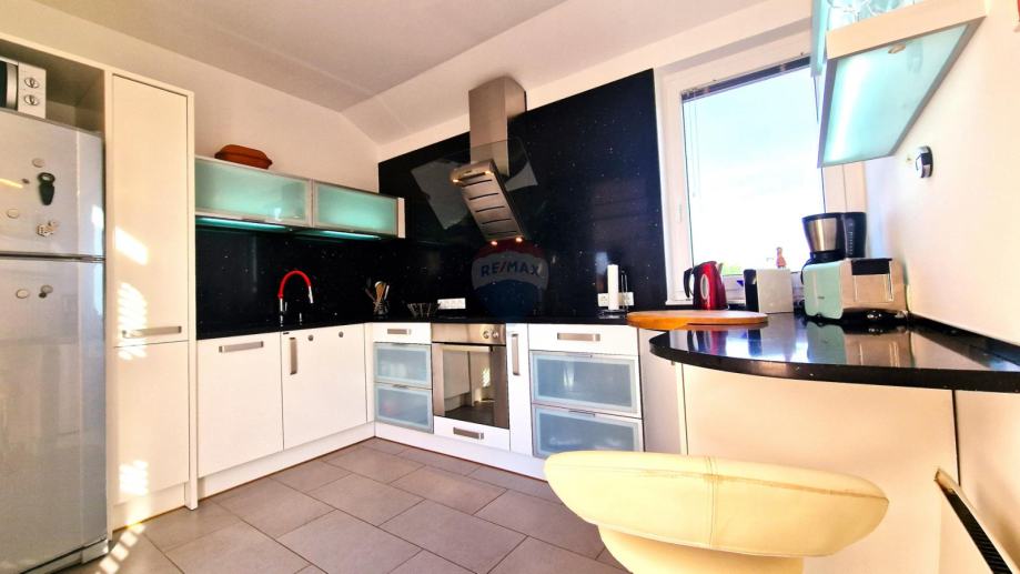 U dnevnom djelu smješteni su dnevni boravak s blagovaonicom i izlazom na čak dva prostrana balkona s kojih se pruža fenomenalan panoramski pogled na more i cijeli grad te zasebne kuhinje potpuno opremljene vrhunskom opremom koja također ima izlaz na balkon i jedne kupaonice.