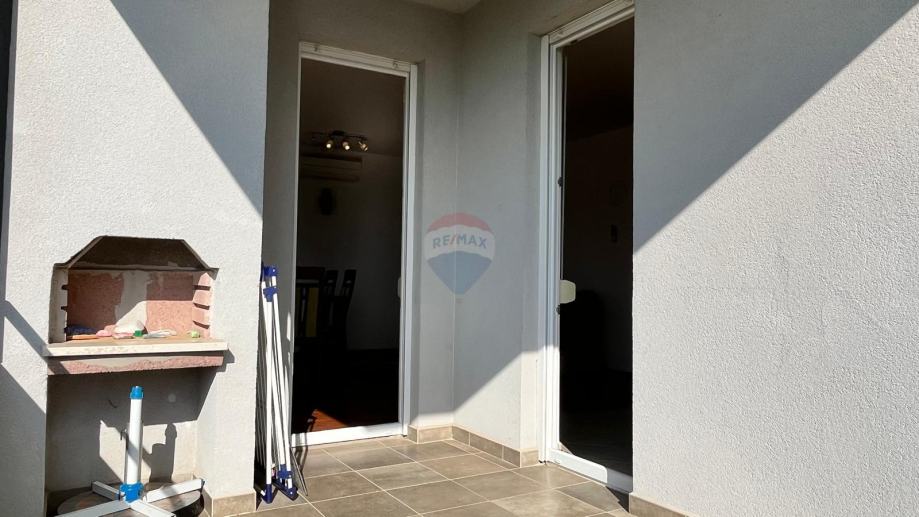Odlična orijentacija stana omogućuje obilje prirodnog svjetla tijekom cijelog dana. Velika terasa savršeno je osmišljena za opuštanje i druženje, a sadrži i kamin za roštiljanje, idealan za ljetne večeri. S terase se pruža pogled na zajednički bazen sa sunčalištem i uređenim vrtom, stvarajući pravu oazu mira.