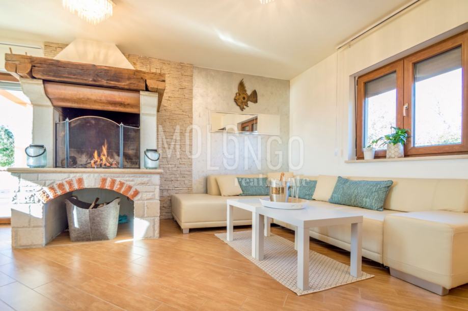 Kuća ima predivan dnevni prostor kojim prevladava uređeni kamin koji znatno doprinosi ugodnom boravku tijekom cijele godine.