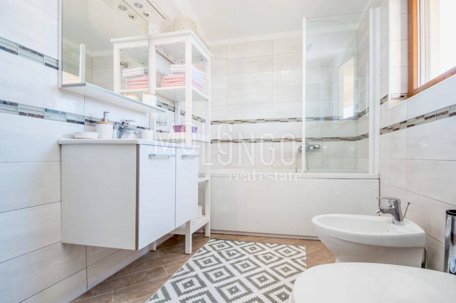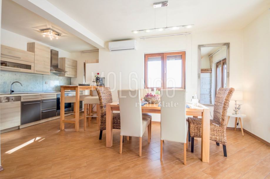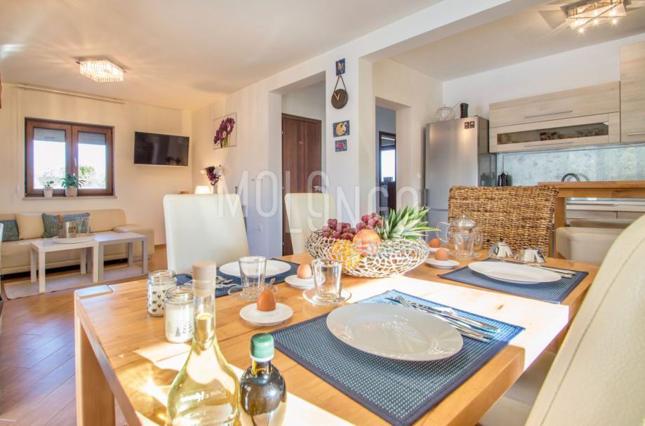 Dnevni boravak dijeli veliku prostoriju s kuhinjom i blagovaonom iz koje se izlazi na osunčanu terasu.