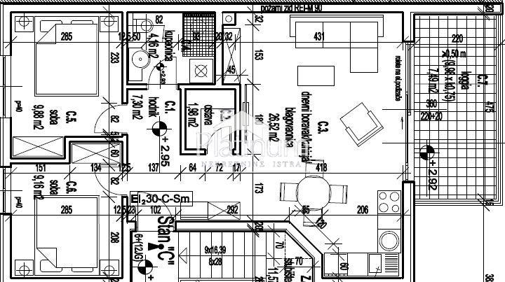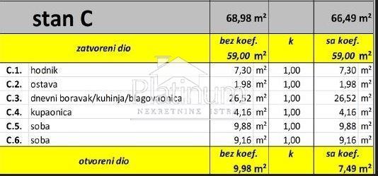 Oglašeni apartman na prvom katu netto površine je 66,49m2 + parkirno mjesto 3,13 m2. Stan se sastoji od hodnika (7,3 m2), ostave (1,98 m2), dnevnog boravka sa kuhinjom i blagovaonom (26,52 m2), kupaonce (4,16 m2), sobe (9,88 m2), sobe (9,16 m2) i terase (7,49 m2).