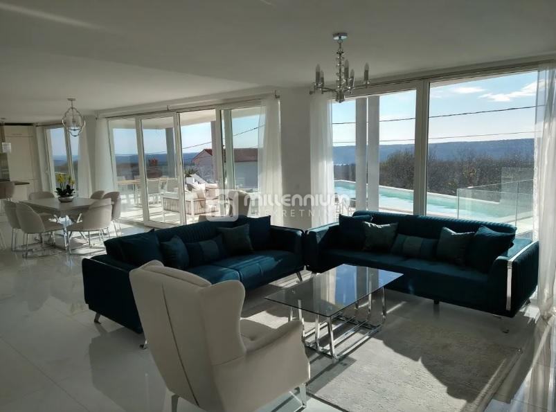 Prizemlje se odlikuje otvorenim konceptom koji povezuje dnevni boravak, blagovaonicu i kuhinju, stvarajući prostrano i svijetlo okruženje. Osim toga, na ovoj razini nalazi se toalet za goste i ostava, što povećava praktičnost i funkcionalnost prostora. Iz dnevnog boravka izlazi se na sunčalište i bazen, idealno za opuštanje i uživanje na svježem zraku.