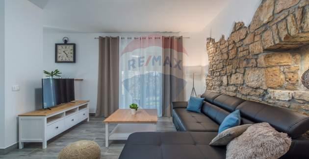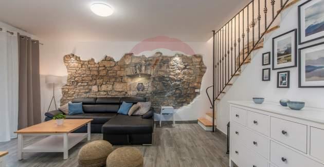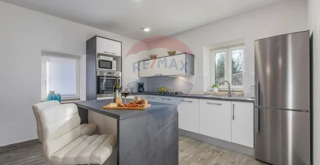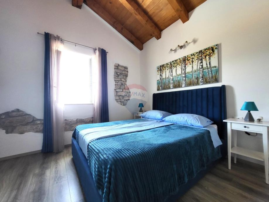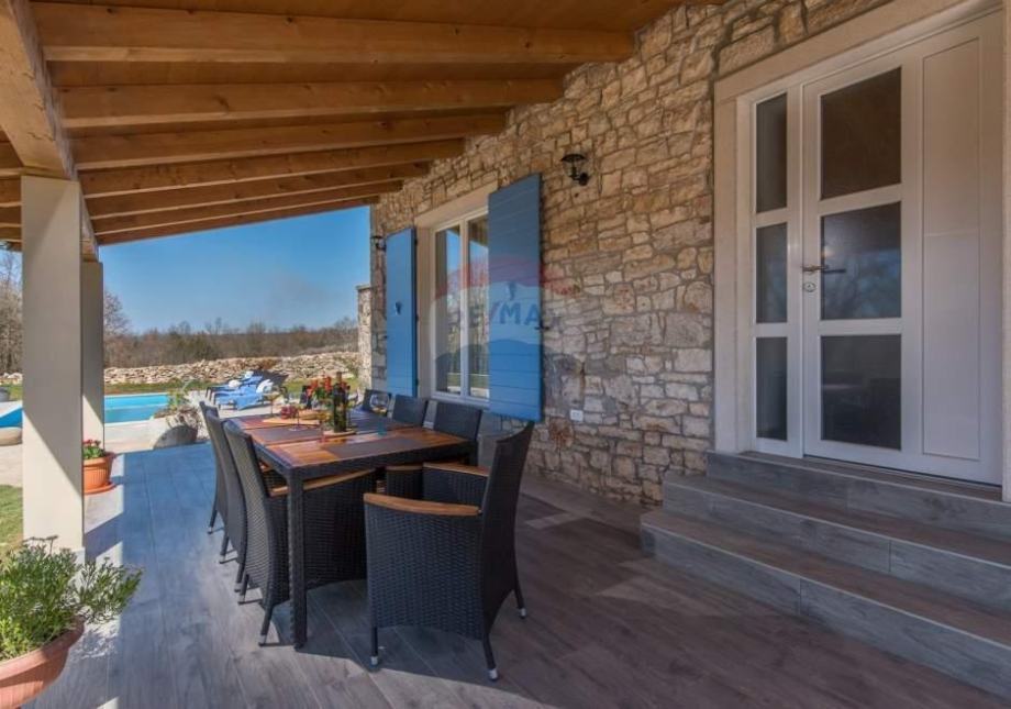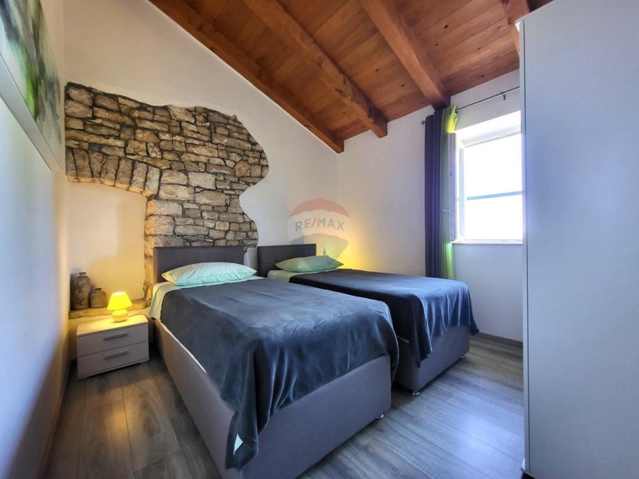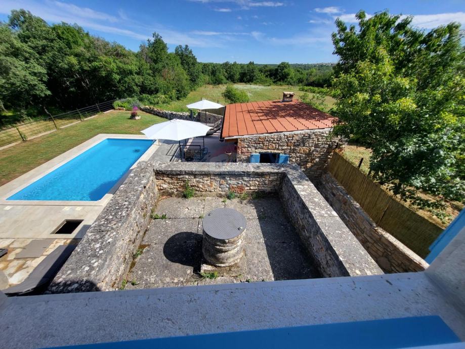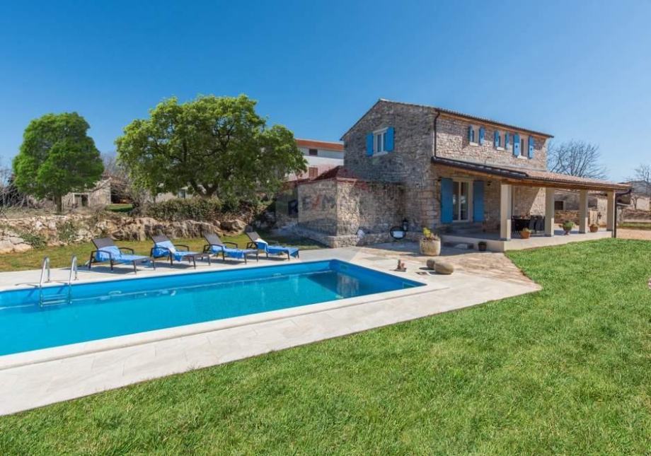 Kuća je autohtona istarska kamena, stara preko 100 godina, i potpuno renovirana 2019.godine. Kuća je koncipirana kao katnica, ukupne površine kuće 120m2. U prizemlju kuće se nalazi dnevni dio, ulazni prostor, veliki dnevni boravak sa kuhinjom i blagavaonom i kupaonicom. Iz dnevnoga boravka izlazi se na veliku natkrivenu verandu koja tijekom cijeloga dana pruža hladovinu. Idealno mjesto za druženje i boravak. Na katu su 3 spavaće sobe i dvije kupaonice. Jedna spavaća soba, master bedroom ima svoju vlastitu kupaonicu. Kuća je klimatizirana, a debeli kameni zidovi služe kao odlična izolacija jer po ljeti drže temperaturu u kući ugodnom za boravak, dok po zimi održavaju toplinu. Kuća ima i vlastitu šternu/cisternu za vodu, koja nije u funkciji ali bi se mogla iskoristiti kao dodatni prostor, iznad šterne je velika terasa, a tu je smještena i velika natkrivena terasa sa ljetnom kuhinjom. Kuća je okrenuta na zapadnu stranu, kako se nalazi na rubu mjesta i na rubu građevinskoga dijela, gleda na šumu i zelenilo. Ispred kuće se nalazi velika okućnica na kojoj je vlasnik napravio stazu za cross i trekking u duljini 400m, koja se odlično uklopila u okoliš i konfiguraciju terena. Potpuni mir, tišina i cvrkut ptičica. Kuća je smještena na velikoj okućnici što budućem vlasniku garantira mir i tišinu.