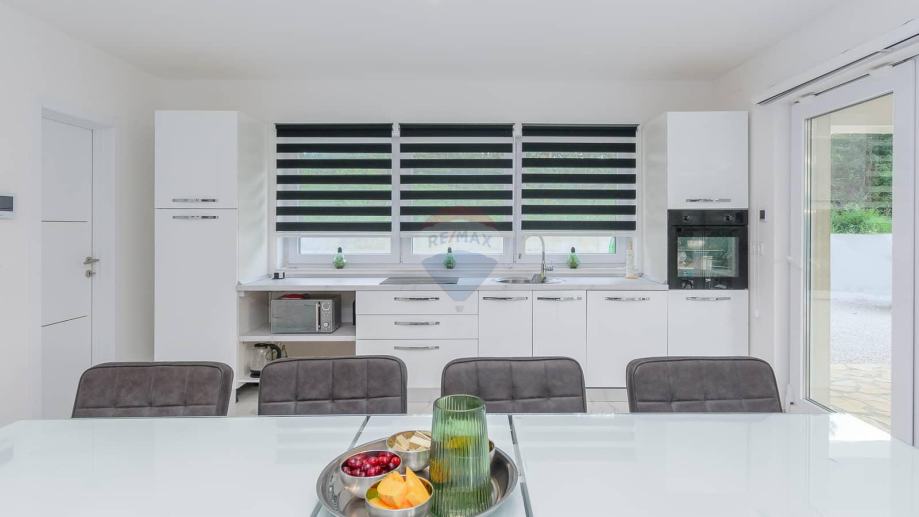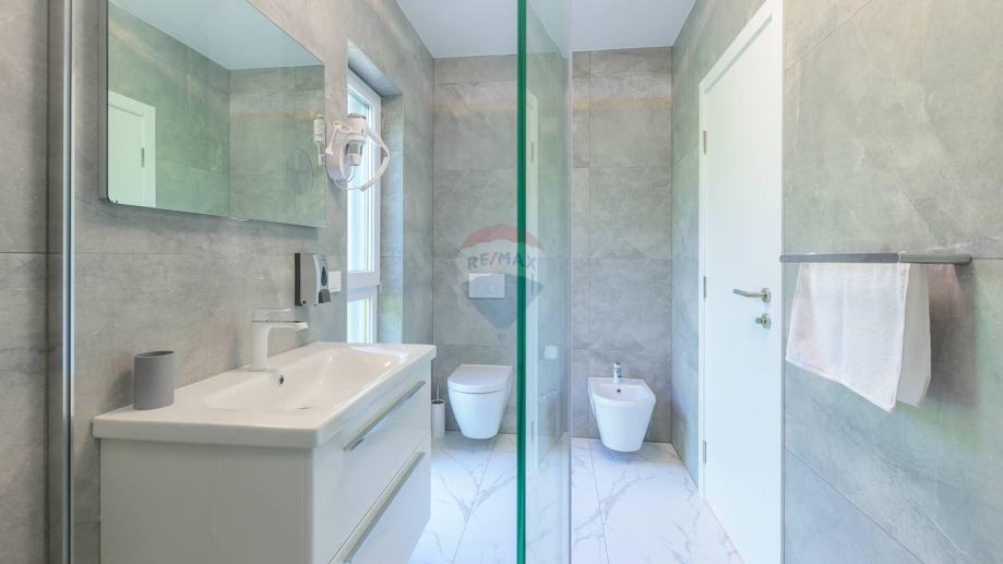 Prodaje se nova moderna luksuzna villa u okolici Svetvinčenta, u manjem mjestu na odličnoj lokaciji. Villa se nalazi u samome srcu malenoga mjesta, a opet pruža mir i privatnost budućim vlasnicima ili gostima. Smještena je na velikoj okućnici od 1001m2, a sama villa ima netto površinu 167m2 koje se prostiru na dvije etaže. Sastoji se od prizemlja u kojemu dominira veliki dnevni boravak sa kaminom, kuhinja, blagavaona, toalet, malo spremište te jedna spavaća soba sa kupaonom. Iz blagavaone i dnevnoga boravka izlazi se direktno na vanjski prostor za druženje, bazen i ljetnu kuhinju sa vanjskim kaminom. Bazen je površine 40m2, a oko njega je uređeno sunčalište u istarskome stilu. Na katu se nalaze još 3 spavaće sobe, svaka sa svojom kupaonom i izlaskom na prostranu terasu.