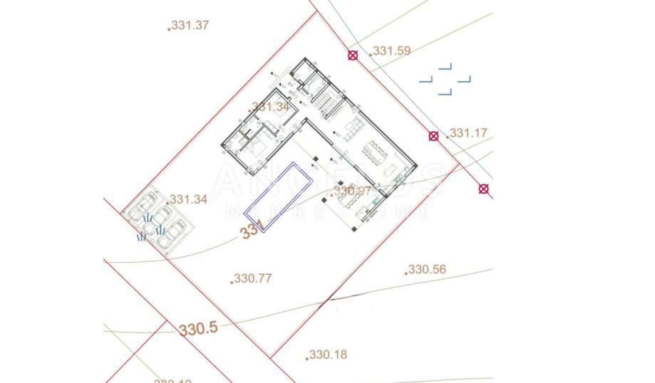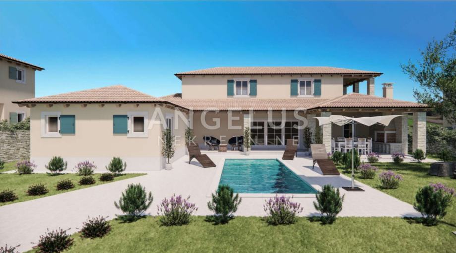 Objekt je smješten na parceli veličine 911 m2, u središnjem djelu odmah uz terasu dominira bazen dimenzije 10x3 m sa plažom obloženom u tradicionalan Istarski kamen projektirano u konceptu da pruža intimu u odnosu na okolne objekte. Natkriveni parking za automobile će biti popločen betonskim pločama. Pročelje objekta će se izvesti u vidu termo fasade 10 cm debljine u kombinaciji sa Istarskim kamenom, a krovište se izvodi drvenim gredama sa izolacijom od kamene vune sa crijepom kao pokrovom. Nekretnina je projektirana tako da je okrenuta na jugozapad kako bi se osigurala maksimalna osunčanost tokom cijelog dana.