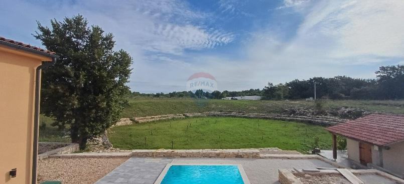 RE/MAX Centar nekretnina prodaje kuću s bazenom i okućnicom. Nalazi se u manjem mirnom mjestu na lokaciji s pregršt zelenila i sa pogledom na lijepu valu (zelenu dolinu) sa mladim maslinama ispred kuće.