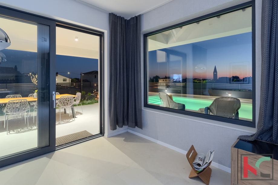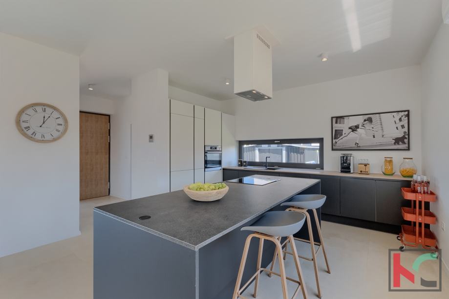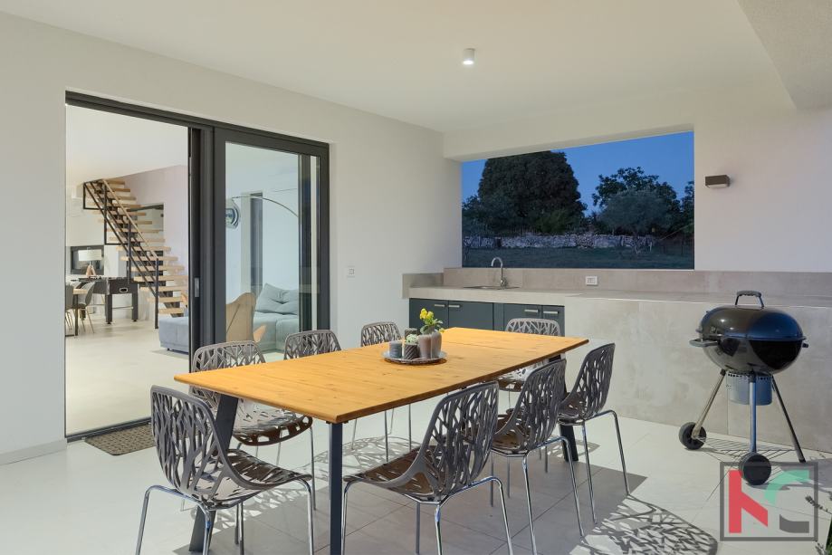 Uz ljetnu kuhinju i dnevni boravak smješten je bazen i sunčalište kao i uređeno dvorište i travnjak sa navodnjavanjem.