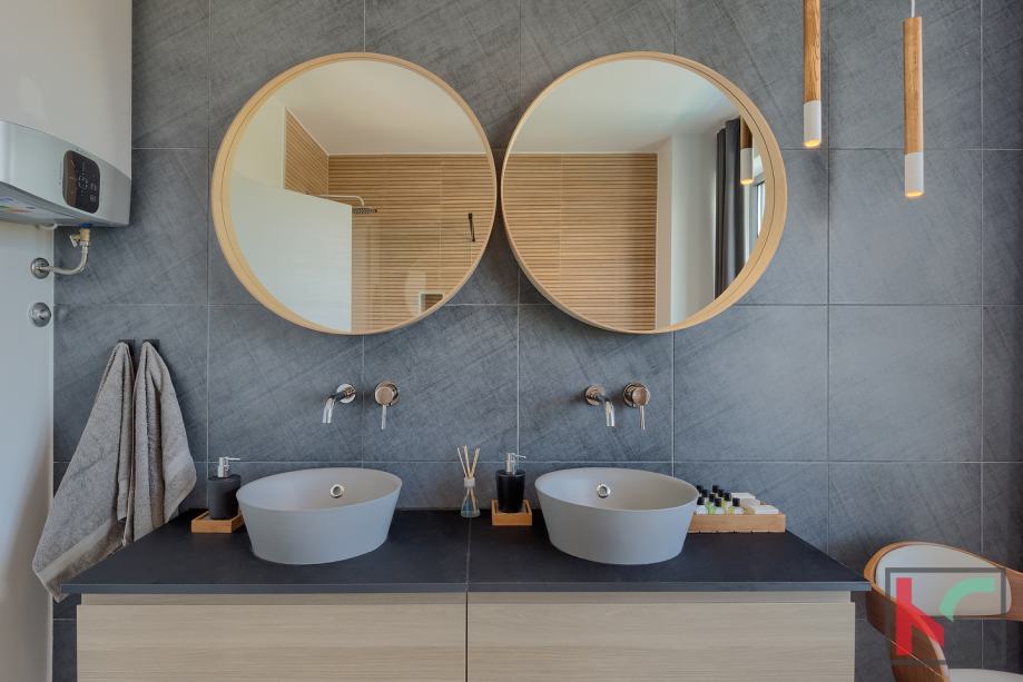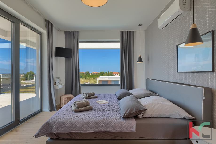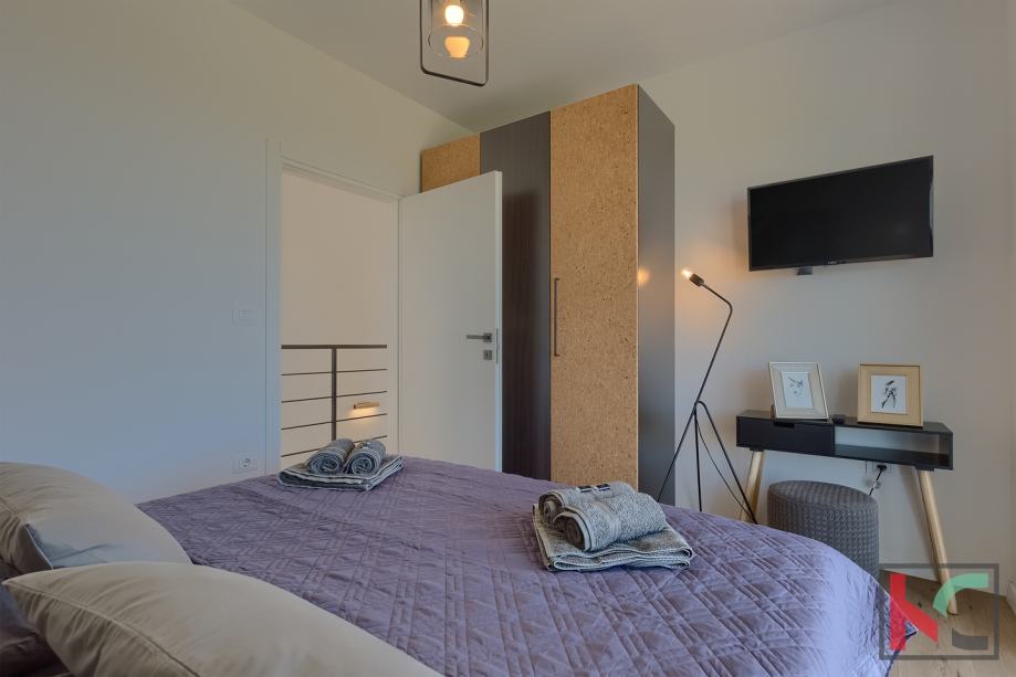 Interijer je opremljen kvalitetnom namještajem i sa puno ukusa u dizajnu. Sve prostorije su klimatizirane, a u dnevnom boravku smješten je dimnjak tako da postoji mogućnost ugradnje kamina ili grijanja na pelete.