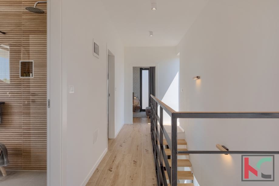 Na prizemnoj etaži prostire se veliki dnevni boravak sa kuhinjom i blagovaonom, hodnik i kupaona te otvorene stepenice koje vode na kat. Na katu se nalaze tri spavaće sobe, kupatilo i dvije velike terase sa pogledom na more. U jednoj od soba na katu sve je pripremljeno za dodatno kupatilo.
