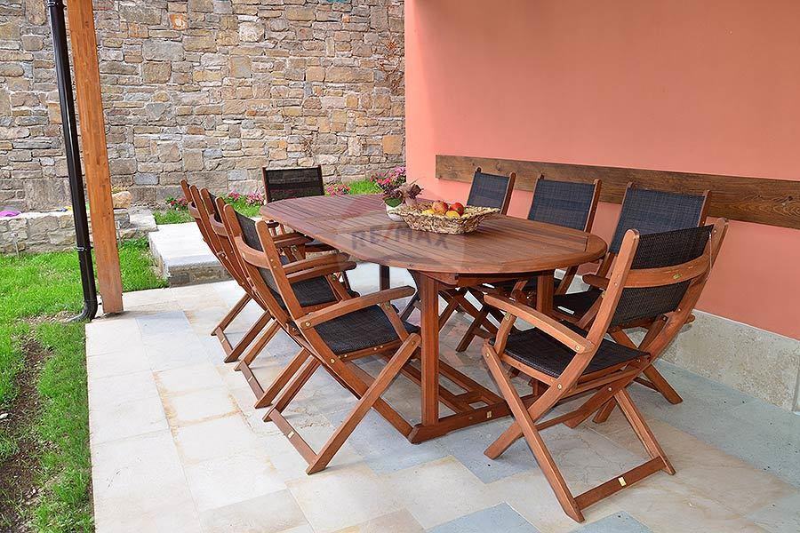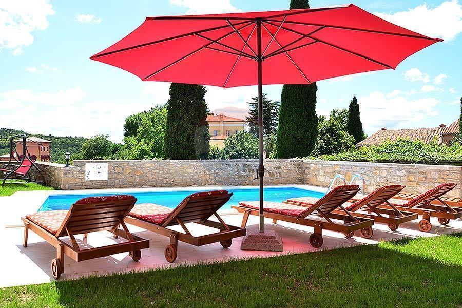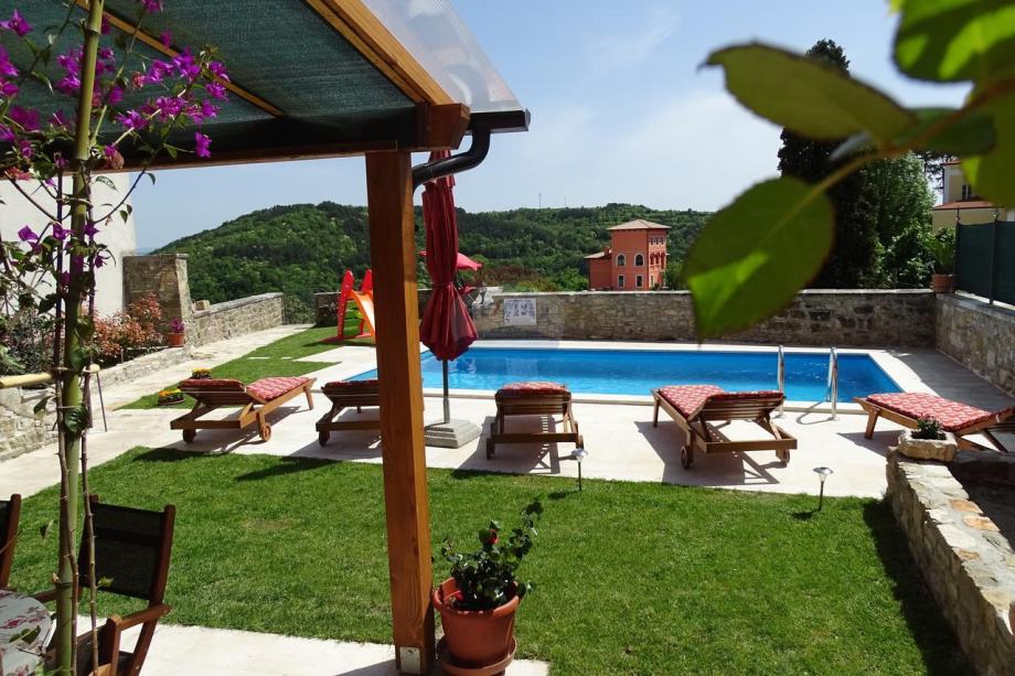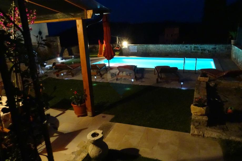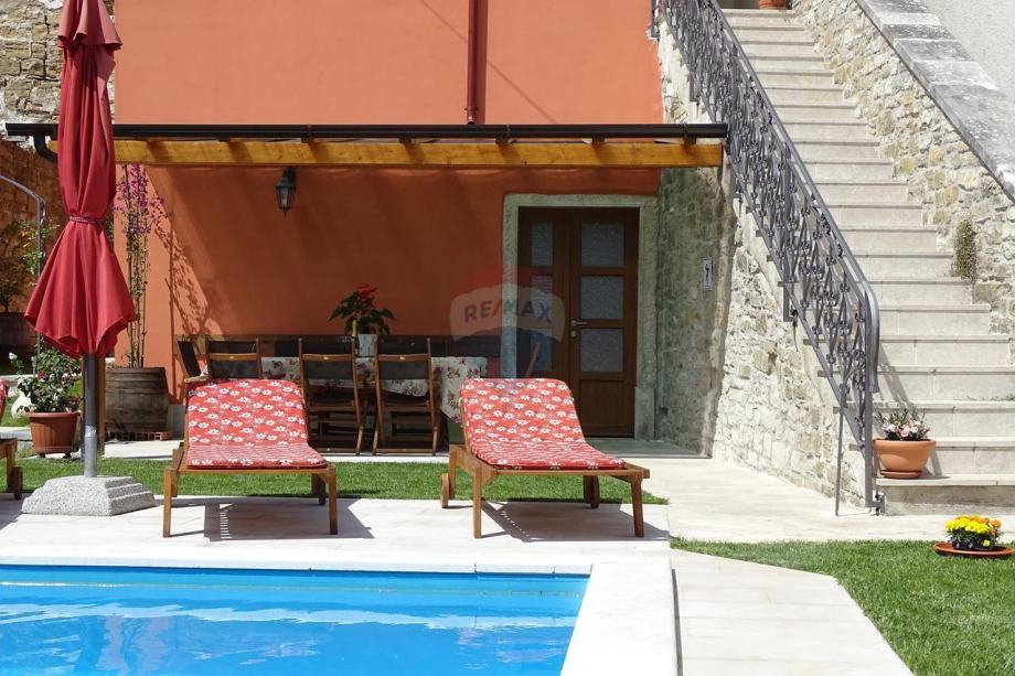 Kuća ima dva ulaza, sa strane trga te starim autohtonim stepenicama, kojima se penjemo do kuće gdje se nalazi okućnica, bazen sa sunčalištem i malo dječje igralište.