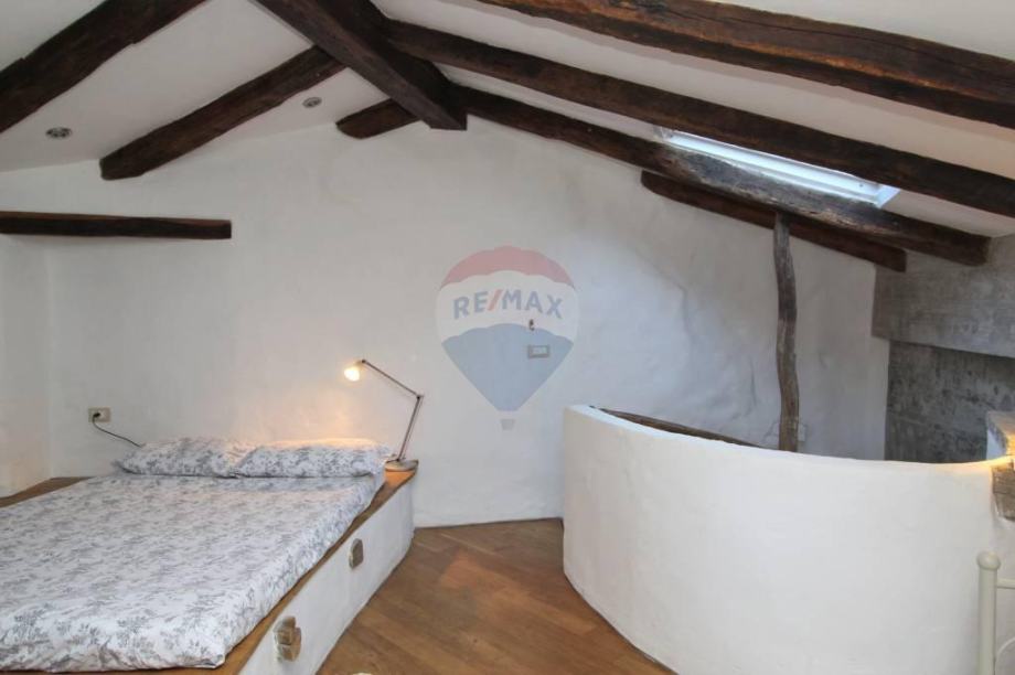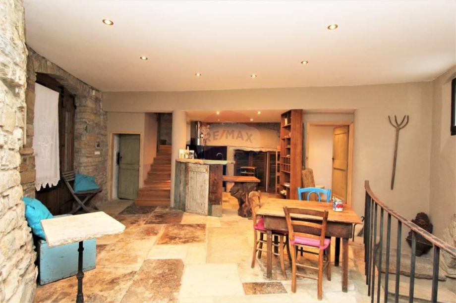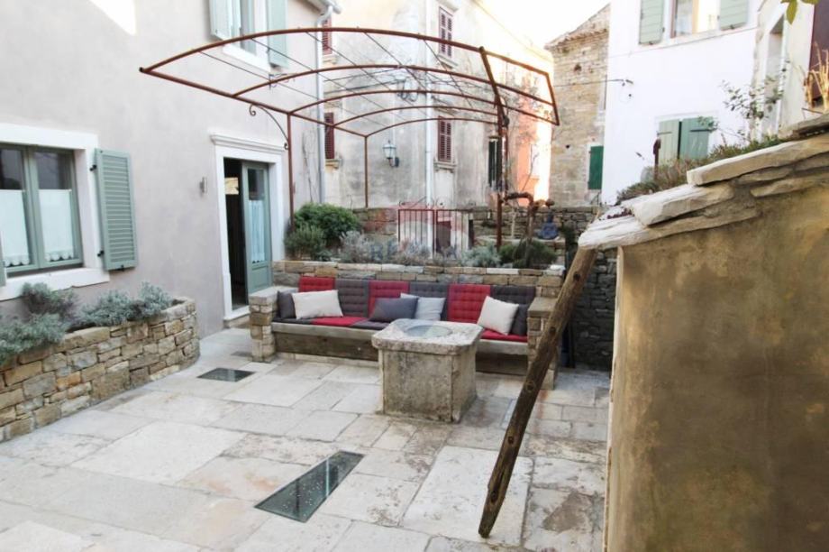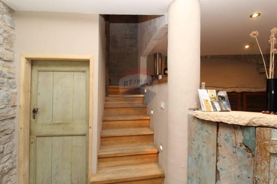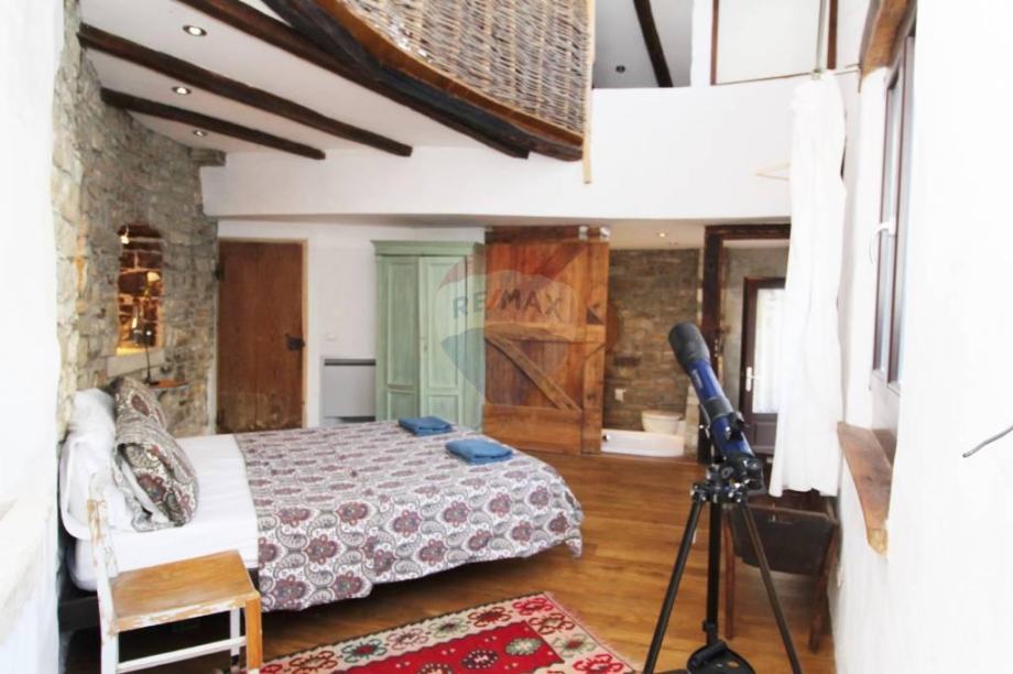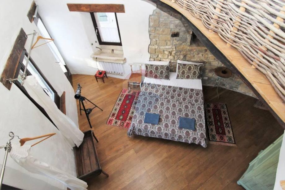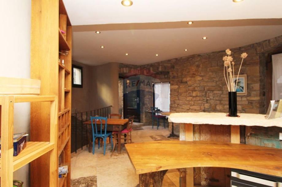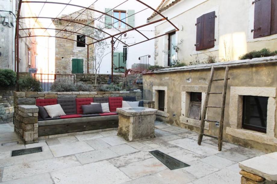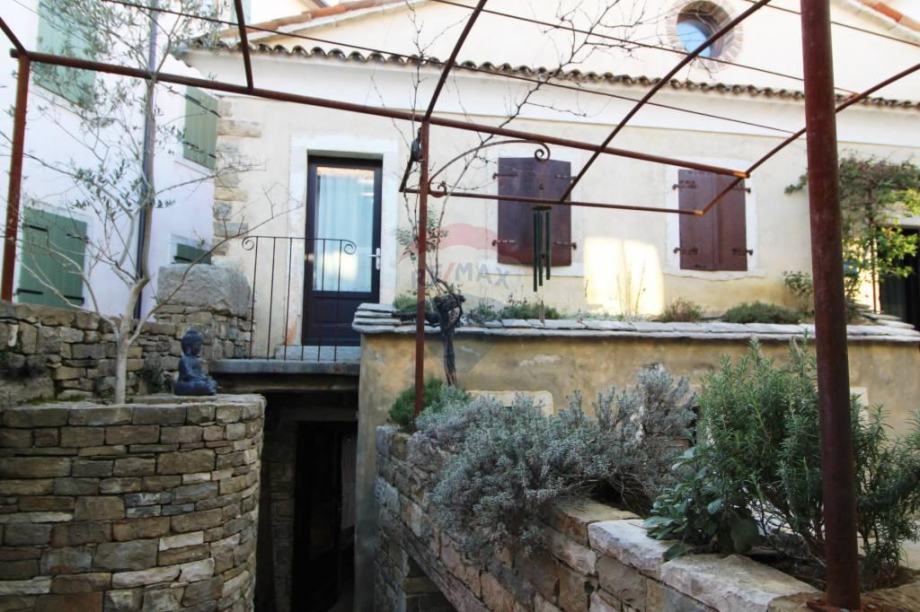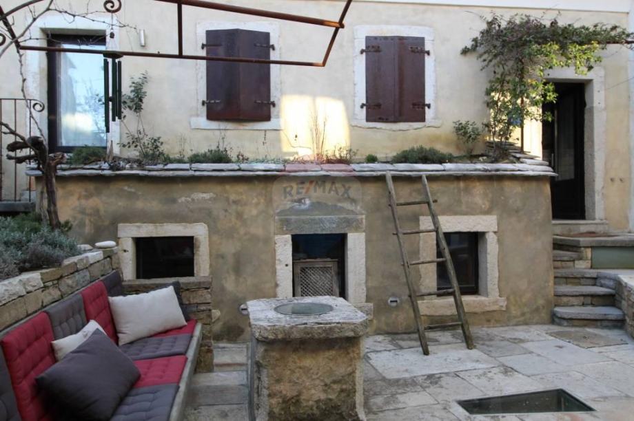 U srcu Istre u malom srednjovjekovnom brdovitom mjestu, između kamenom popločanih ulica i gradskih zidina smještene su ove dvije vrlo zanimljive i posebne kuće. Povezane su zajedničkim kamenim dvorištem, gdje je smješten starinski bunar, kamena klupa, te manji jedinstveni kameni bazen/jacuzzi. Manja kuća ima ulaz i sa glavne ceste, te se cijela prizemna etaža vodi kao poslovni prostor. Sve odiše ugodom uz mnoštvo istarskih detalja, evidentno je da se izuzetno pazilo na svaki detalj, kuća je sređena sa puno pažnje i ukusa. Manja se kuća sastoji od ukopane stare cisterne preuređene u prostoriju za opuštanje i dnevni boravak U prizemlju nalazi se blagovaona i kuhinja, te manja ostava.Drvenim se stepenicama stiže do 1.kata gdje se smjestila stilizirana spavaća soba i kupaonica. Dalje se stepenicama stiže do mansarde gdje je još jedna soba i kupaonica.U kući je podno grijanje izvedeno na svim betonskim podovima. Veća se kuća sastoji od velike prostrane blagovaone sa kaminom, te moderno opremljene kuhinje. koja sigurno zadovoljava svojom funkcionalnošću. Na prvom se katu nalaze dvije spavaće sobe, te kupaonica i toalet.Kuće se prodaju kao jedna cjelina.Izuzetno maštovita i interesantna nekretnina kako za bavljenje turizmom tako i za cjelogodišnji boravak za sve koji se žele povući od gradskog meteža i buke u mirno i idilično mjesto.