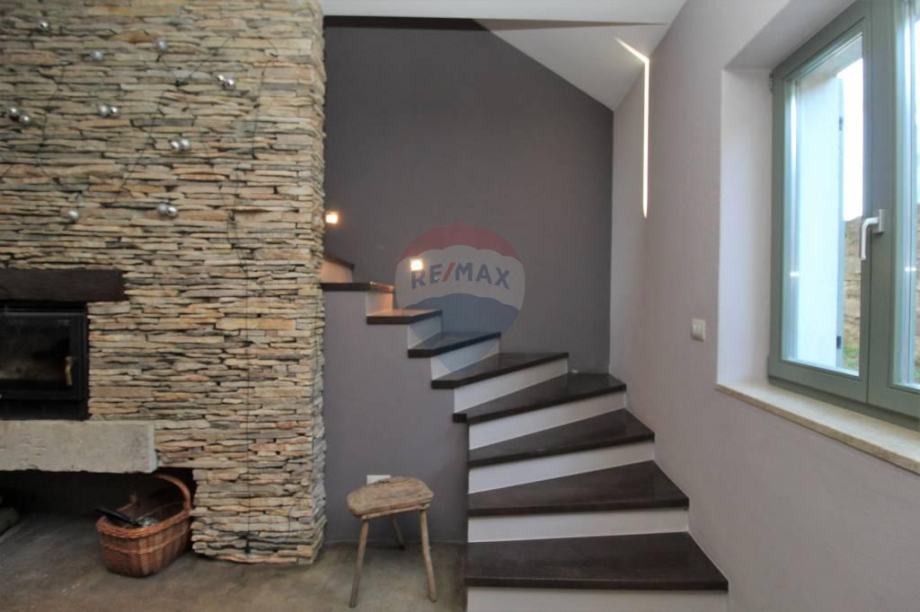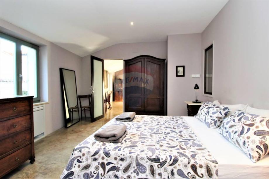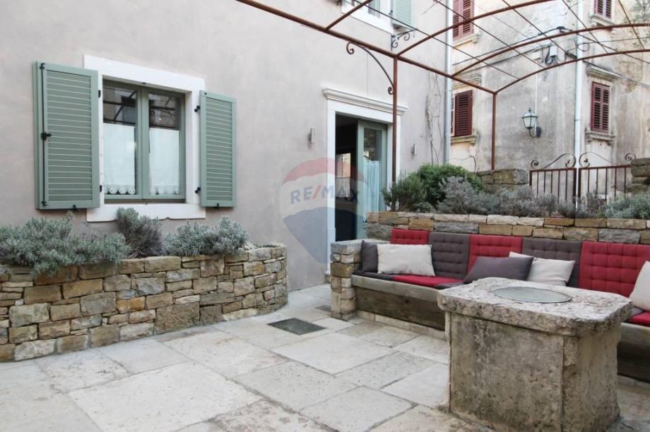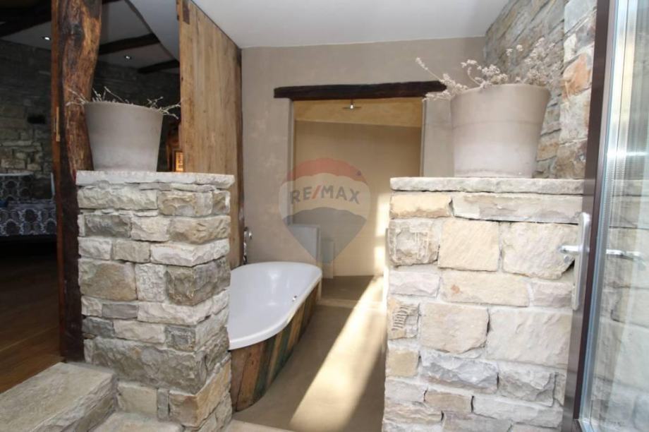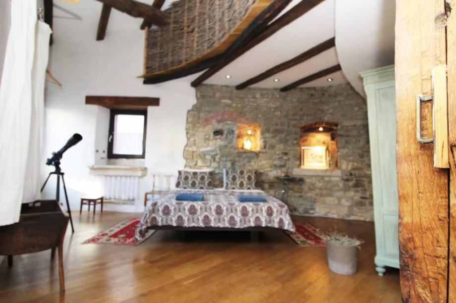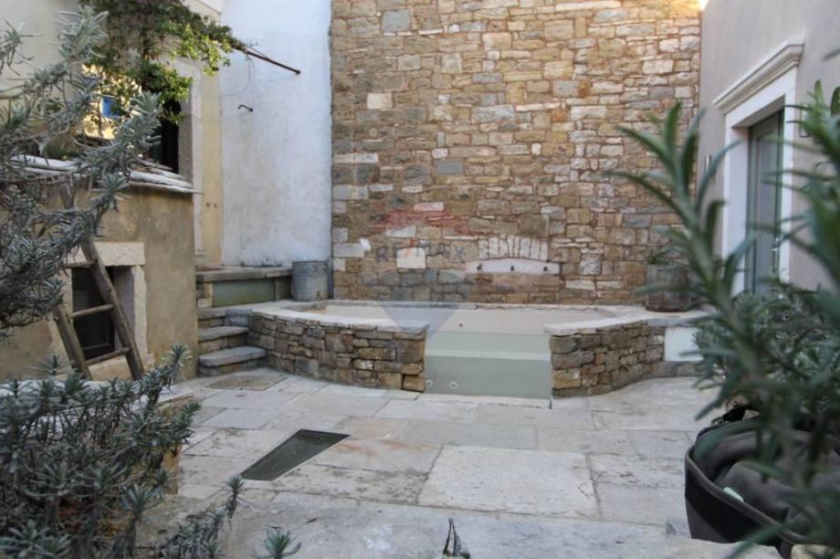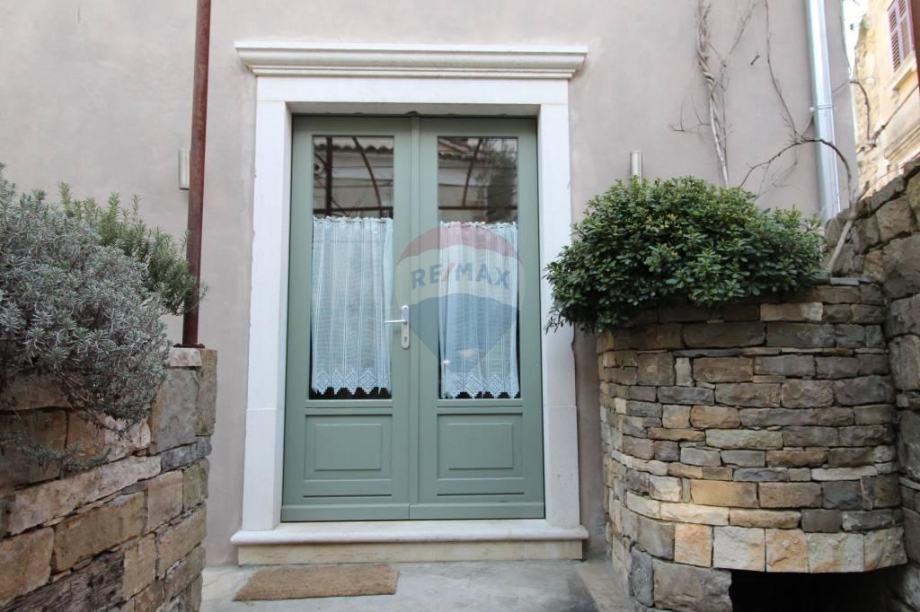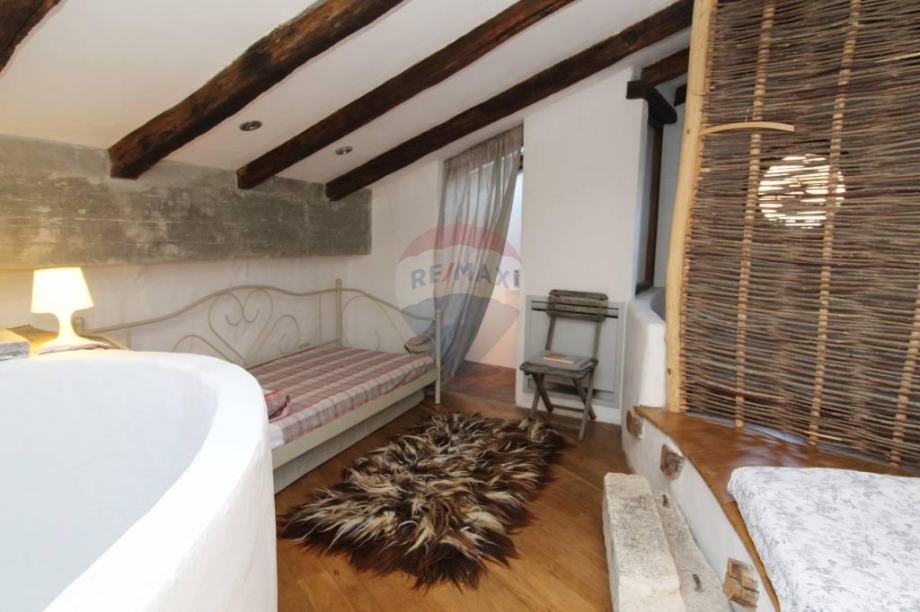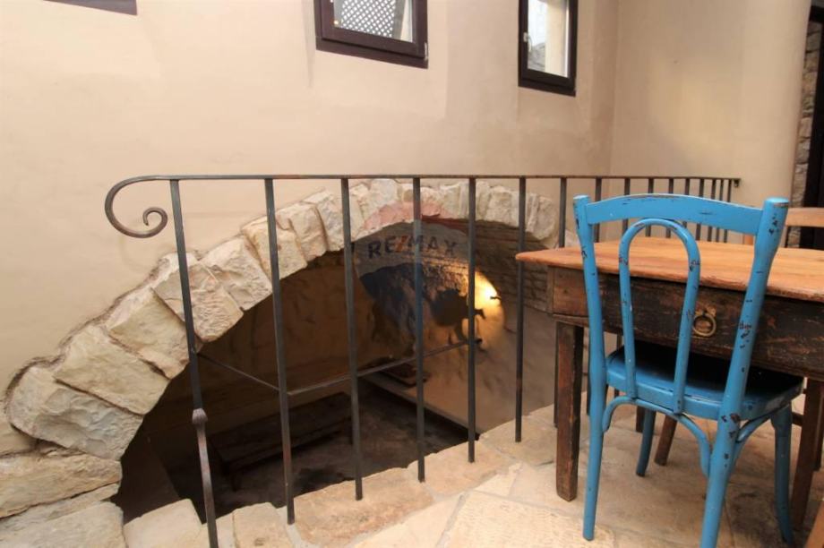 U srcu Istre u malom srednjovjekovnom brdovitom mjestu, između kamenom popločanih ulica i gradskih zidina smještene su ove dvije vrlo zanimljive i posebne kuće. Povezane su zajedničkim kamenim dvorištem, gdje je smješten starinski bunar, kamena klupa, te manji jedinstveni kameni bazen/jacuzzi. Manja kuća ima ulaz i sa glavne ceste, te se cijela prizemna etaža vodi kao poslovni prostor. Sve odiše ugodom uz mnoštvo istarskih detalja, evidentno je da se izuzetno pazilo na svaki detalj, kuća je sređena sa puno pažnje i ukusa. Manja se kuća sastoji od ukopane stare cisterne preuređene u prostoriju za opuštanje i dnevni boravak U prizemlju nalazi se blagovaona i kuhinja, te manja ostava.Drvenim se stepenicama stiže do 1.kata gdje se smjestila stilizirana spavaća soba i kupaonica. Dalje se stepenicama stiže do mansarde gdje je još jedna soba i kupaonica.U kući je podno grijanje izvedeno na svim betonskim podovima. Veća se kuća sastoji od velike prostrane blagovaone sa kaminom, te moderno opremljene kuhinje. koja sigurno zadovoljava svojom funkcionalnošću. Na prvom se katu nalaze dvije spavaće sobe, te kupaonica i toalet.Kuće se prodaju kao jedna cjelina.Izuzetno maštovita i interesantna nekretnina kako za bavljenje turizmom tako i za cjelogodišnji boravak za sve koji se žele povući od gradskog meteža i buke u mirno i idilično mjesto.