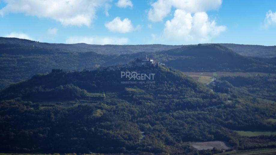 Građevinsko zemljište u blizini Oprtalja nudi spektakularan pogled na povijesni grad Motovun, što ga čini izuzetno atraktivnim za izgradnju kuće. Takav pogled ima svoju cijenu.