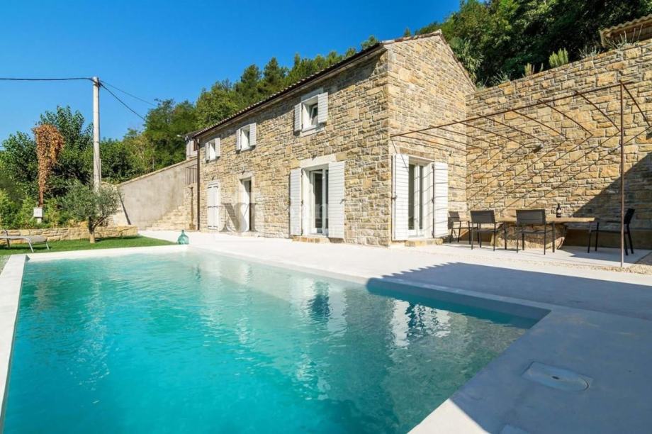Dnevni prostor nekretnine ima izlaz u vrt u kojem se nalazi grijani bazen sa zonom za sunčanje.